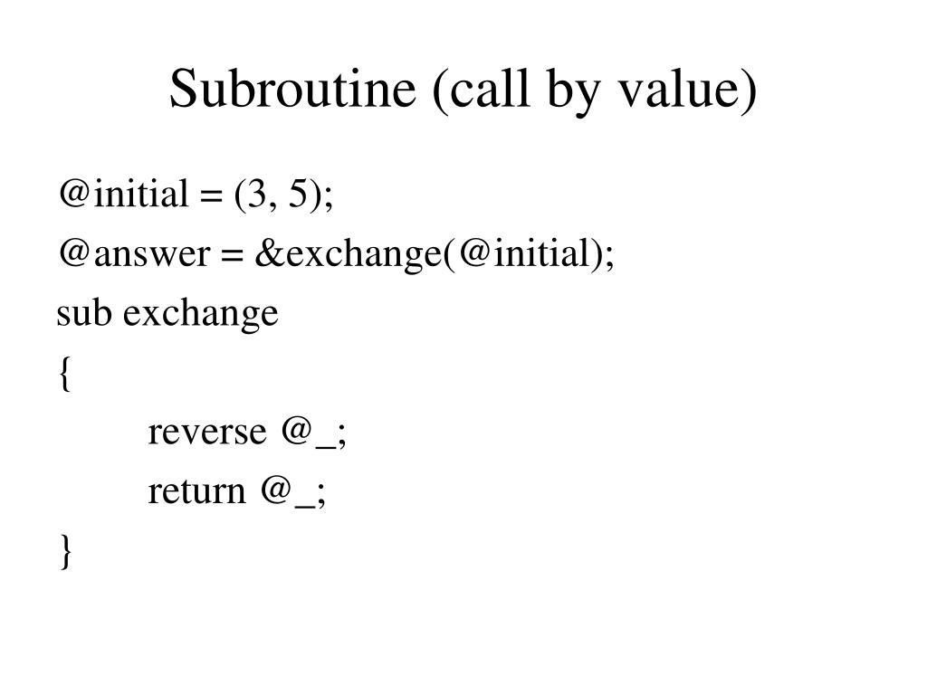Subroutine (call by value) @initial = (3, 5); @answer = &exchange(@initial); sub exchange { reverse @_; return @_; }