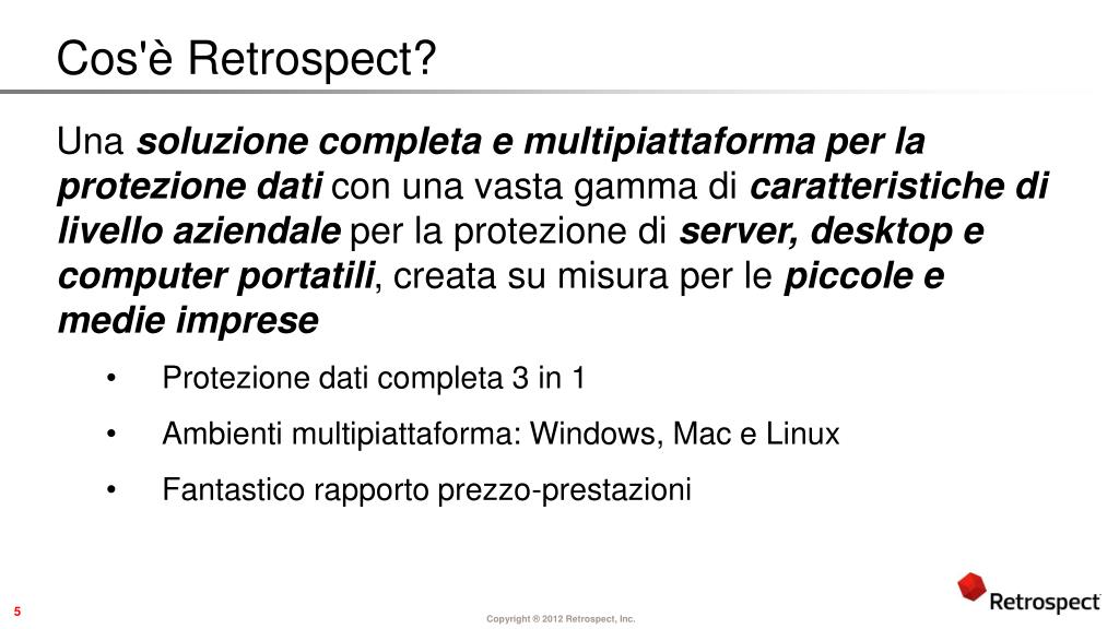 4 Retrospect Protegge… • Imprese con da 1 a 250 computer con server e workstation; gestione di sistemiMac, Windows, e Linux misti, da un solo computer host di backup centralizzato • Piccole e medieimprese: Banche, Studimedici, Ospedali, Studilegali, Agenzieimmobiliari, etc. • Piccoliuffici e ufficiprivati: Consulenti, Dirigenti, Insegnanti, etc. • Reparti di organizzazionipiùgrandi: Grafica, Amministrazione, Marketing, Spedizioni, Vendite, etc. • Università, Scuolesuperiori e Scuoleprimarie • Governo e ForzeArmate (settorigovernativi e militari) 4