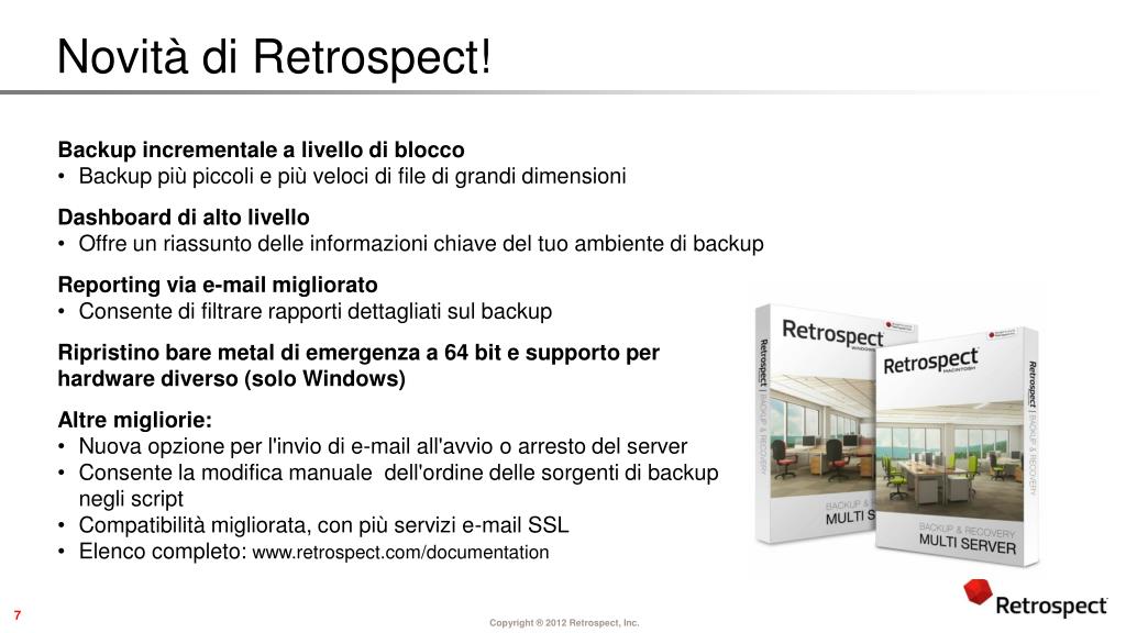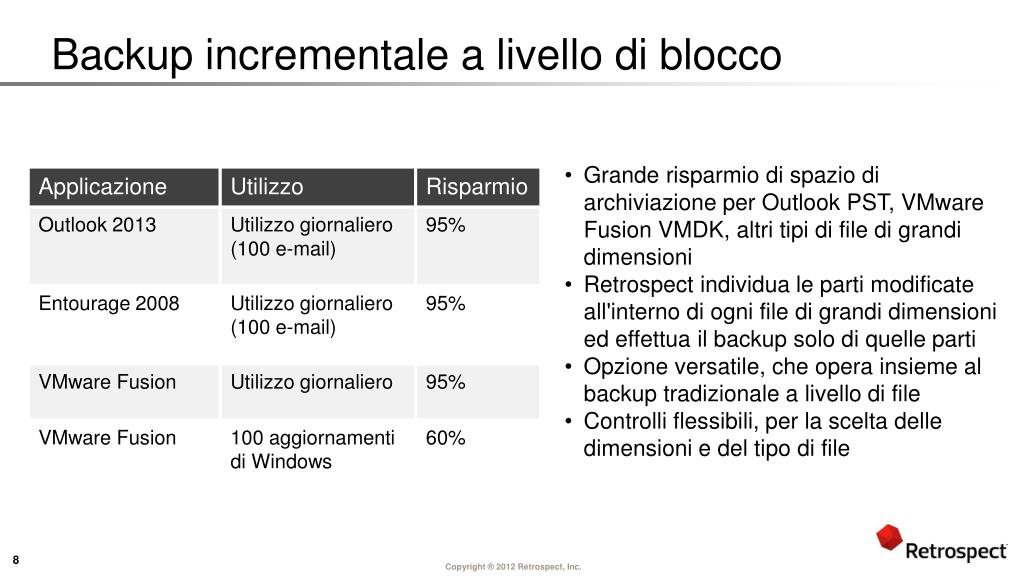 Risoluzione delle sfide del cliente grazie a Retrospect Retrospect fa risparmiare denaro e risorse • Rientra nei budget limitati di PMI e SOHO • Fornisce un'ampia protezione senza complessità o richiesta elevata di risorse IT • Protegge dall'alto costo della perdita di dati • Perdita di dati aziendali = perdita dell'azienda • I servizi di ripristino dei dati sono estremamente costosi e non sono sempre erogati • Risulta scalabile per gestire la rapida crescita dei dati e l'aumento delle richieste • I backup incrementali e i ripristini intelligenti copiano solo file univoci • Protegge set di dati nei file aperti che comprendono più volumi
