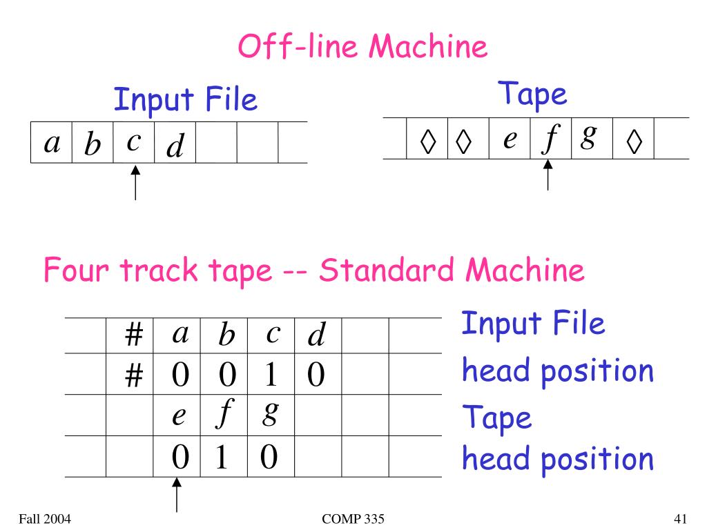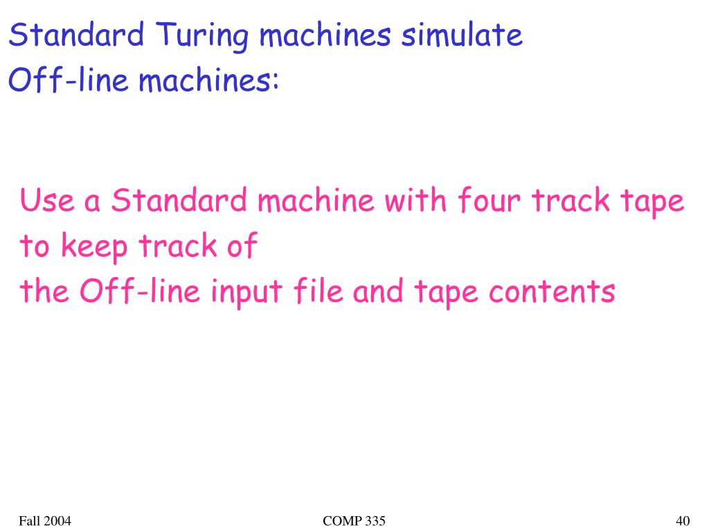Standard Turing machines simulate Off-line machines: Use a Standard machine with four track tape to keep track of the Off-line input file and tape contents COMP 335