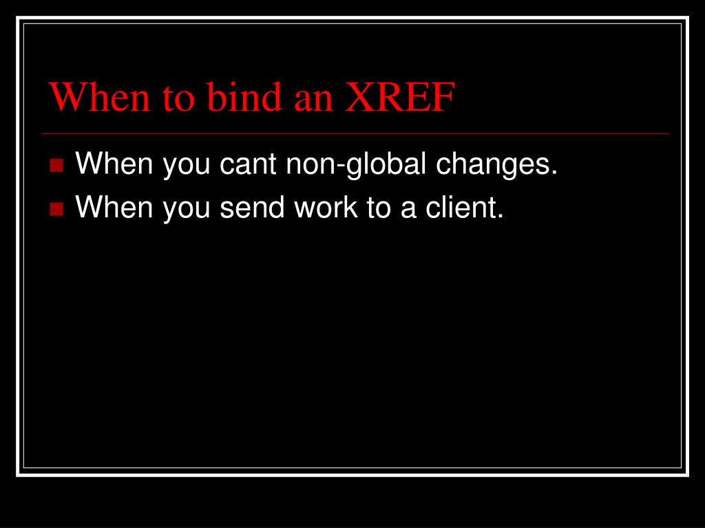 When to bind an XREF • When you cant non-global changes. • When you send work to a client.