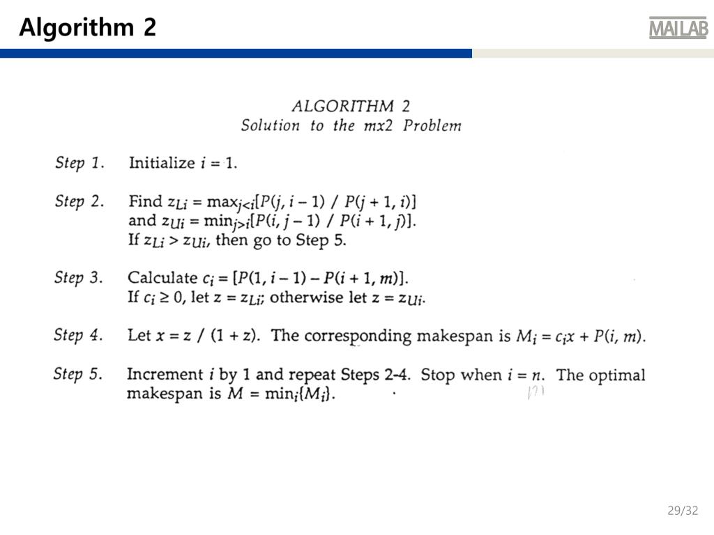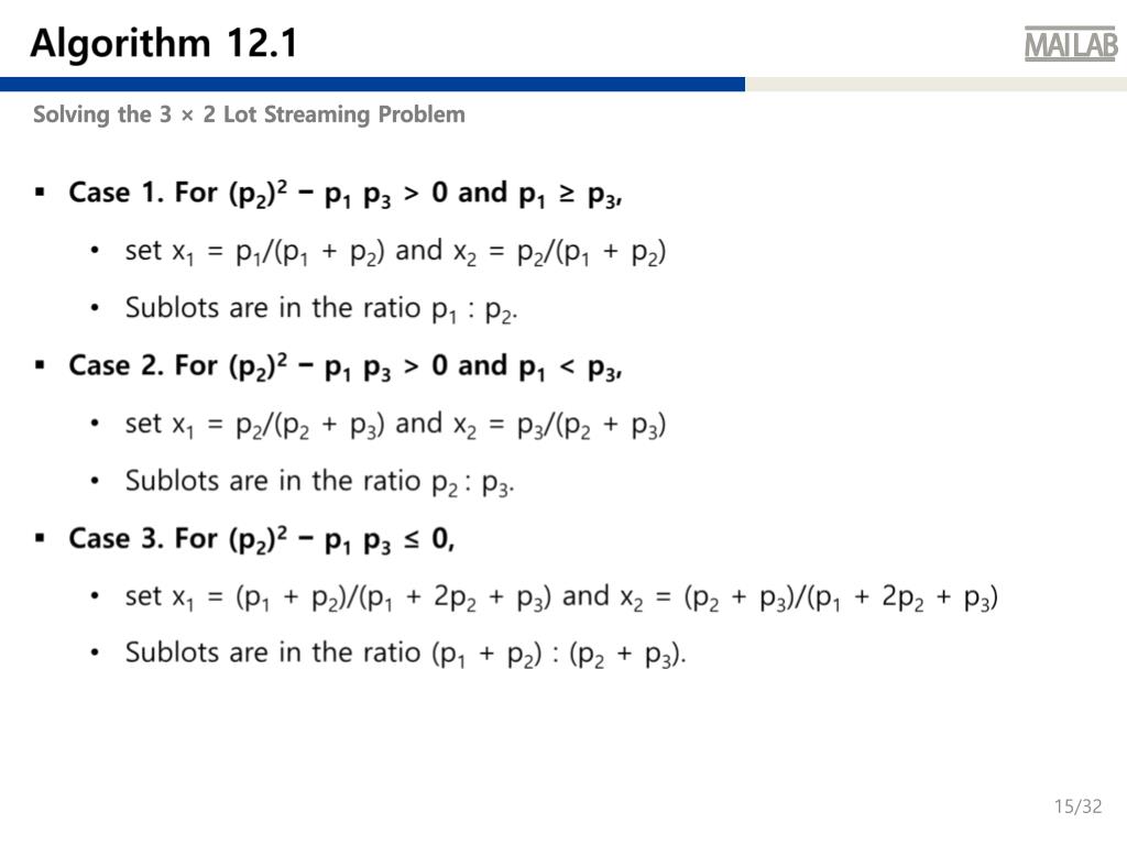 Algorithm 12.1 Solving the 3 × 2 Lot Streaming Problem • Case 1. For (p2)2 − p1 p3 > 0 and p1 ≥ p3, • set x1 = p1/(p1 + p2) and x2 = p2/(p1 + p2) • Sublots are in the ratio p1 : p2. • Case 2. For (p2)2 − p1 p3 > 0 and p1 < p3, • set x1 = p2/(p2 + p3) and x2 = p3/(p2 + p3) • Sublots are in the ratio p2 : p3. • Case 3. For (p2)2 − p1 p3 ≤ 0, • set x1 = (p1 + p2)/(p1 + 2p2 + p3) and x2 = (p2 + p3)/(p1 + 2p2 + p3) • Sublots are in the ratio (p1 + p2) : (p2 + p3).