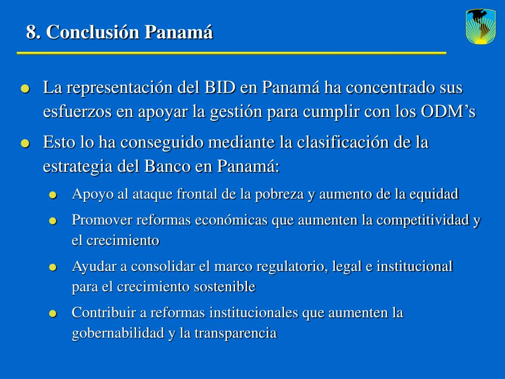 8. Conclusión Panamá • La representación del BID en Panamá ha concentrado sus esfuerzos en apoyar la gestión para cumplir con los ODM’s • Esto lo ha conseguido mediante la clasificación de la estrategia del Banco en Panamá: • Apoyo al ataque frontal de la pobreza y aumento de la equidad • Promover reformas económicas que aumenten la competitividad y el crecimiento • Ayudar a consolidar el marco regulatorio, legal e institucional para el crecimiento sostenible • Contribuir a reformas institucionales que aumenten la gobernabilidad y la transparencia