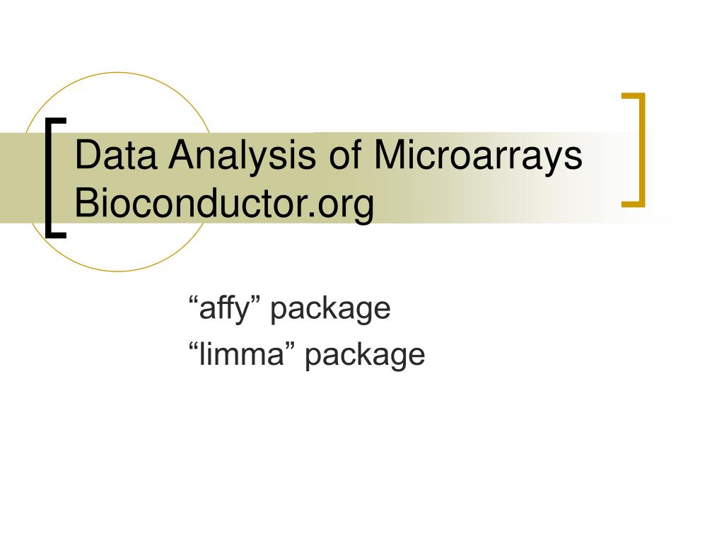 Data Analysis of Microarrays Bioconductor.org. “affy” package “limma” package. Open R and Load libraries. > load(affy). Affymetrix Data files. CEL files contain information about the expression levels of the individual probes.