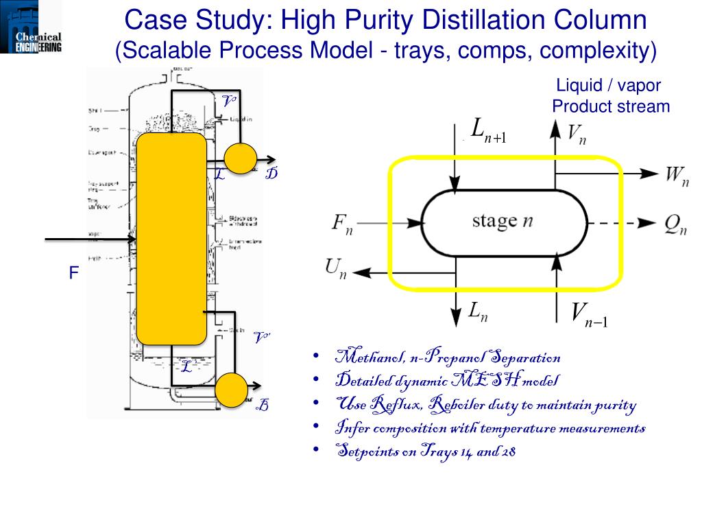 Case Study: High Purity Distillation Column(Scalable Process Model - trays, comps, complexity) Liquid / vapor Product stream V L D F • Methanol, n-Propanol Separation • Detailed dynamic MESH model • Use Reflux, Reboiler duty to maintain purity • Infer composition with temperature measurements • Setpoints on Trays 14 and 28 V’ L’ B