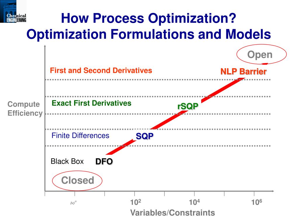How Process Optimization?Optimization Formulations and Models Open First and Second Derivatives NLP Barrier Exact First Derivatives Compute Efficiency rSQP Finite Differences SQP DFO Black Box Closed 102 104 106 100 Variables/Constraints