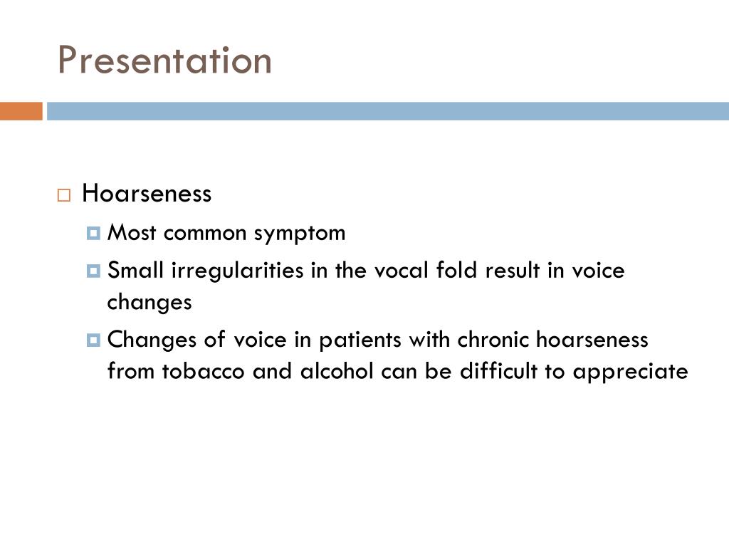 Presentation • Hoarseness • Most common symptom • Small irregularities in the vocal fold result in voice changes • Changes of voice in patients with chronic hoarseness from tobacco and alcohol can be difficult to appreciate