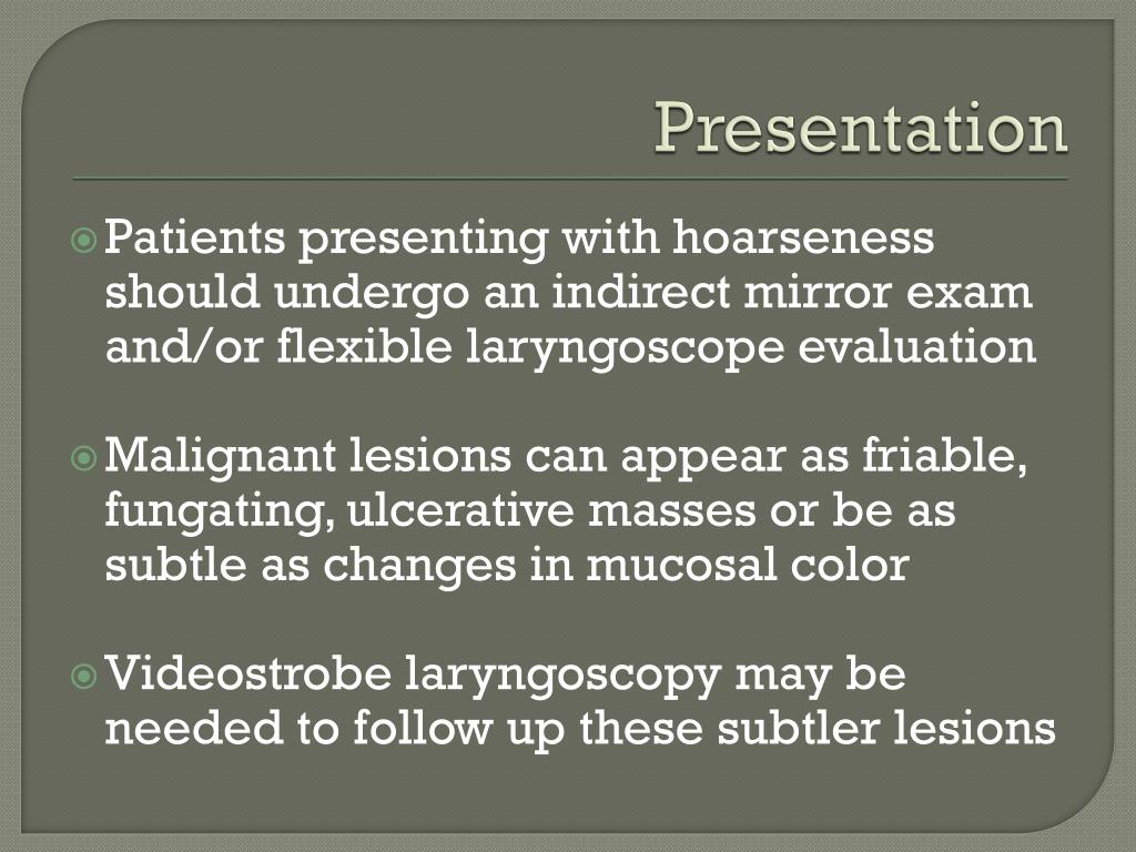 Presentation Patients presenting with hoarseness should undergo an indirect mirror exam and/or flexible laryngoscope evaluation Malignant lesions can appear as friable, fungating, ulcerative masses or be as subtle as changes in mucosal color Videostrobelaryngoscopy may be needed to follow up these subtler lesions