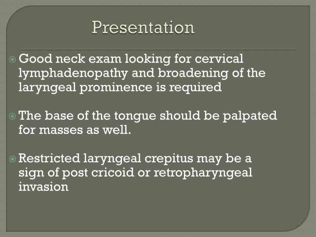 Presentation Good neck exam looking for cervical lymphadenopathy and broadening of the laryngeal prominence is required The base of the tongue should be palpated for masses as well. Restricted laryngeal crepitus may be a sign of post cricoid or retropharyngeal invasion
