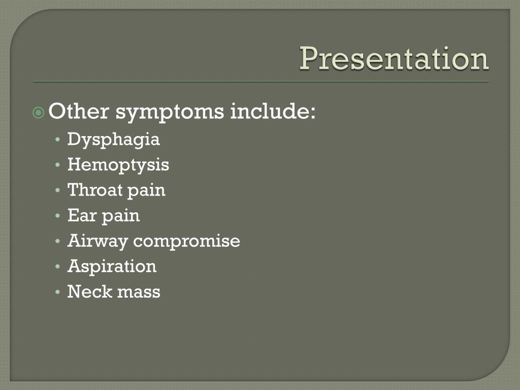 Presentation • Other symptoms include: • Dysphagia • Hemoptysis • Throat pain • Ear pain • Airway compromise • Aspiration • Neck mass