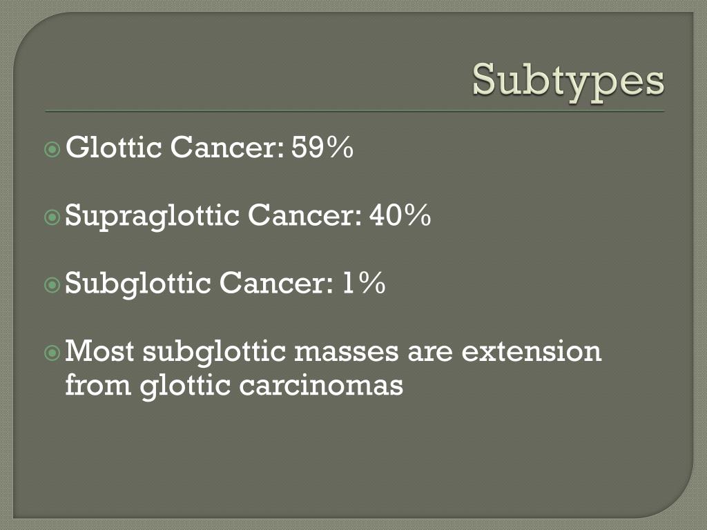 Subtypes Glottic Cancer: 59% Supraglottic Cancer: 40% Subglottic Cancer: 1% Most subglottic masses are extension from glottic carcinomas