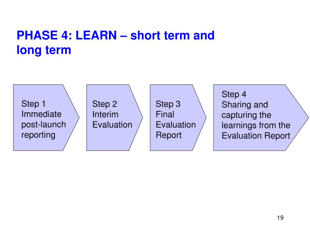 PHASE 4: LEARN – short term and long term Step 4 Sharing and capturing the learnings from the Evaluation Report Step 1 Immediate post-launch reporting Step 2 Interim Evaluation Step 3 Final Evaluation Report
