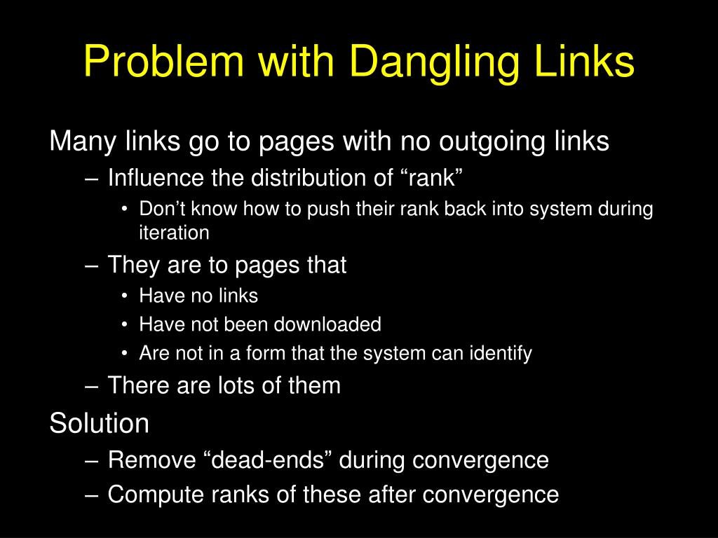 Problem with Dangling Links • Many links go to pages with no outgoing links • Influence the distribution of “rank” • Don’t know how to push their rank back into system during iteration • They are to pages that • Have no links • Have not been downloaded • Are not in a form that the system can identify • There are lots of them • Solution • Remove “dead-ends” during convergence • Compute ranks of these after convergence