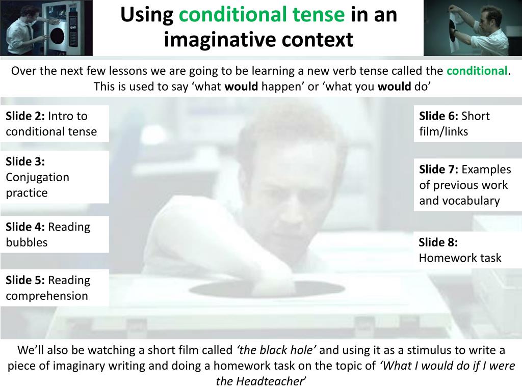 Over the next few lessons we are going to be learning a new verb tense called the conditional . This is used to say ‘what would happen’ or ‘what you would do’. Slide 2: Intro to conditional tense. Slide 6: Short film/links. Slide 3: Conjugation practice.