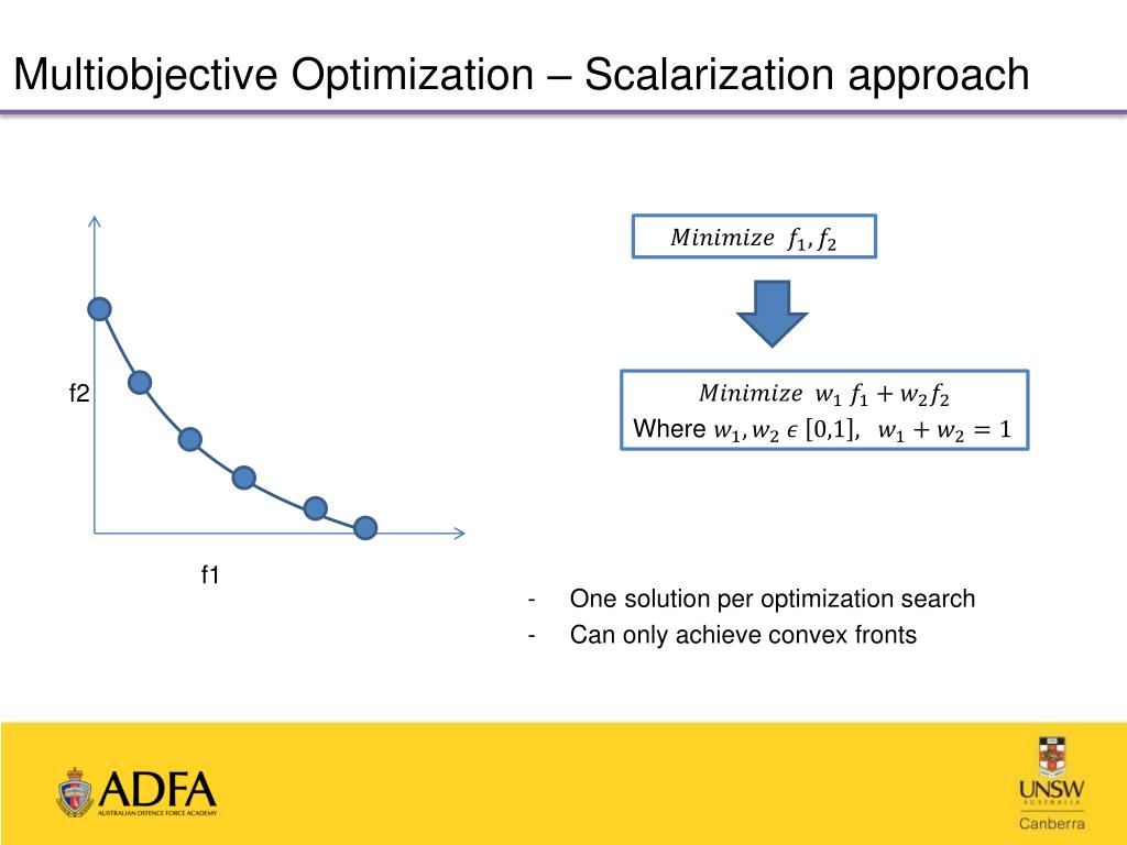 Multiobjective Optimization – Scalarization approach Where f2 f1 • One solution per optimization search • Can only achieve convex fronts