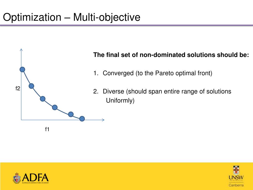 Optimization – Multi-objective The final set of non-dominated solutions should be: • Converged (to the Pareto optimal front) • Diverse (should span entire range of solutions • Uniformly) f2 f1