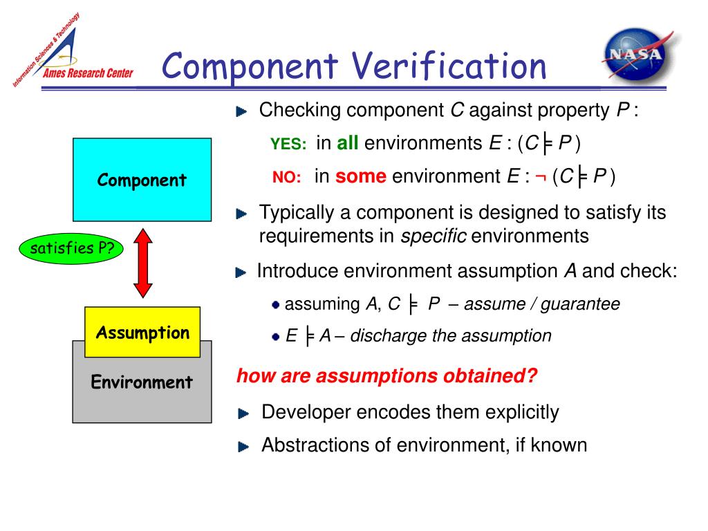 satisfies P? how are assumptions obtained? • Developer encodes them explicitly • Abstractions of environment, if known Component Verification • Checking component C against property P : YES: in allenvironments E : (C╞ P ) NO: in someenvironment E :¬(C╞ P ) • Typically a component is designed to satisfy its requirements in specific environments Component • Introduce environment assumption A and check: • assuming A, C╞P – assume / guarantee • E ╞ A – discharge the assumption Assumption Environment