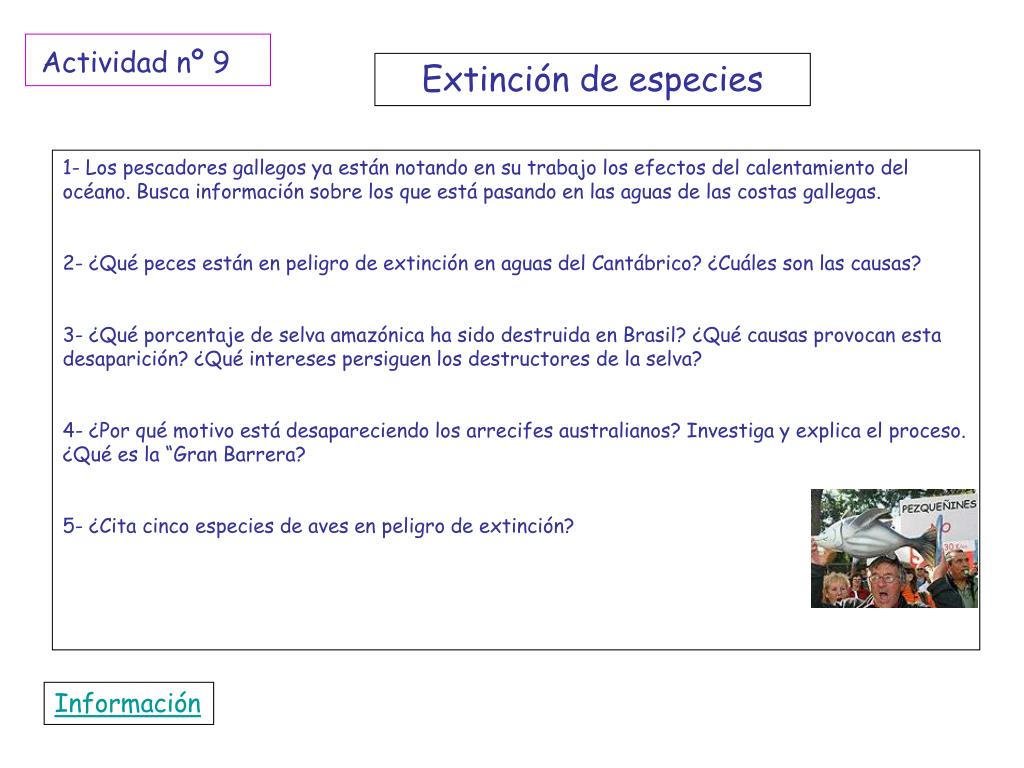 Actividad nº 9 Extinción de especies 1- Los pescadores gallegos ya están notando en su trabajo los efectos del calentamiento del océano. Busca información sobre los que está pasando en las aguas de las costas gallegas. 2- ¿Qué peces están en peligro de extinción en aguas del Cantábrico? ¿Cuáles son las causas? 3- ¿Qué porcentaje de selva amazónica ha sido destruida en Brasil? ¿Qué causas provocan esta desaparición? ¿Qué intereses persiguen los destructores de la selva? 4- ¿Por qué motivo está desapareciendo los arrecifes australianos? Investiga y explica el proceso. ¿Qué es la “Gran Barrera? 5- ¿Cita cinco especies de aves en peligro de extinción? Información