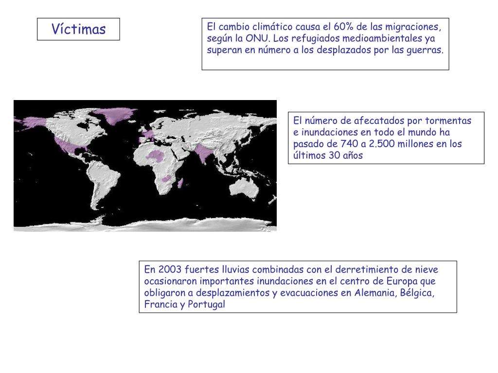 Víctimas El cambio climático causa el 60% de las migraciones, según la ONU. Los refugiados medioambientales ya superan en número a los desplazados por las guerras. El número de afecatados por tormentas e inundaciones en todo el mundo ha pasado de 740 a 2.500 millones en los últimos 30 años En 2003 fuertes lluvias combinadas con el derretimiento de nieve ocasionaron importantes inundaciones en el centro de Europa que obligaron a desplazamientos y evacuaciones en Alemania, Bélgica, Francia y Portugal