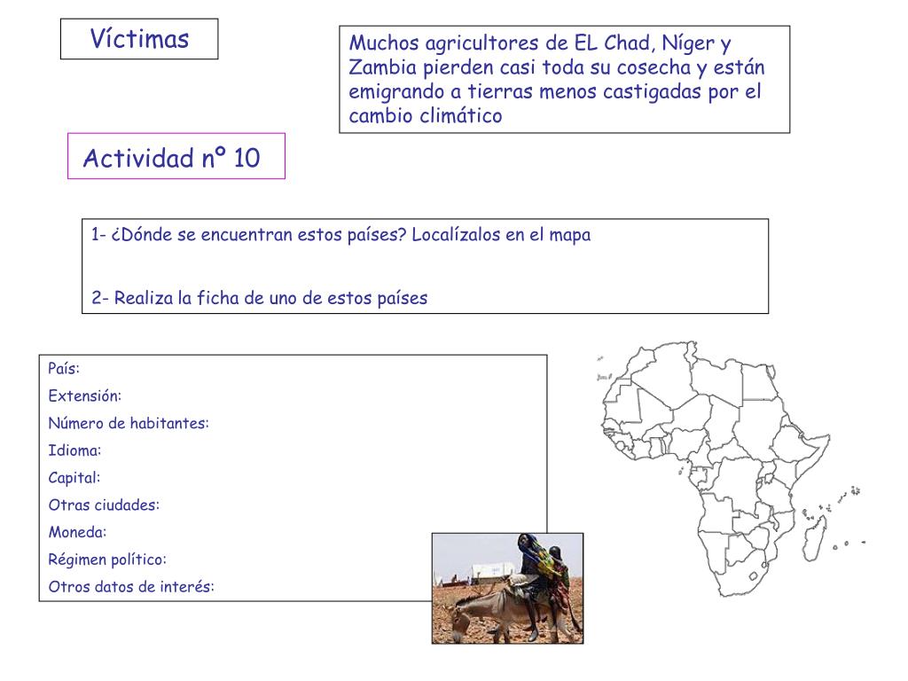Víctimas Muchos agricultores de EL Chad, Níger y Zambia pierden casi toda su cosecha y están emigrando a tierras menos castigadas por el cambio climático Actividad nº 10 1- ¿Dónde se encuentran estos países? Localízalos en el mapa 2- Realiza la ficha de uno de estos países País: Extensión: Número de habitantes: Idioma: Capital: Otras ciudades: Moneda: Régimen político: Otros datos de interés: