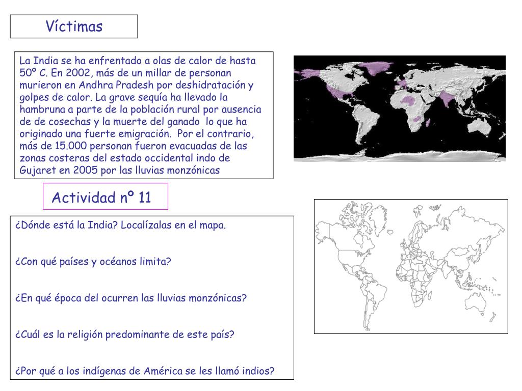 Víctimas La India se ha enfrentado a olas de calor de hasta 50º C. En 2002, más de un millar de personan murieron en Andhra Pradesh por deshidratación y golpes de calor. La grave sequía ha llevado la hambruna a parte de la población rural por ausencia de de cosechas y la muerte del ganado lo que ha originado una fuerte emigración. Por el contrario, más de 15.000 personan fueron evacuadas de las zonas costeras del estado occidental indo de Gujaret en 2005 por las lluvias monzónicas Actividad nº 11 ¿Dónde está la India? Localízalas en el mapa. ¿Con qué países y océanos limita? ¿En qué época del ocurren las lluvias monzónicas? ¿Cuál es la religión predominante de este país? ¿Por qué a los indígenas de América se les llamó indios?