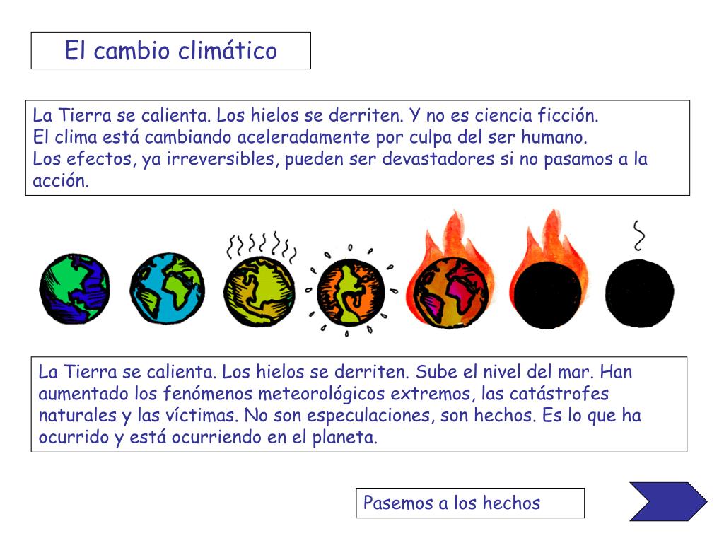 El cambio climático La Tierra se calienta. Los hielos se derriten. Y no es ciencia ficción.El clima está cambiando aceleradamente por culpa del ser humano.Los efectos, ya irreversibles, pueden ser devastadores si no pasamos a la acción. La Tierra se calienta. Los hielos se derriten. Sube el nivel del mar. Han aumentado los fenómenos meteorológicos extremos, las catástrofes naturales y las víctimas. No son especulaciones, son hechos. Es lo que ha ocurrido y está ocurriendo en el planeta. Pasemos a los hechos
