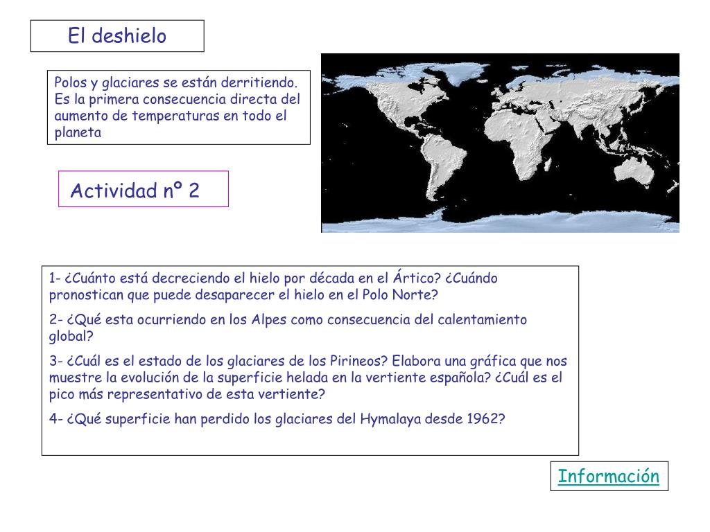 El deshielo Polos y glaciares se están derritiendo. Es la primera consecuencia directa del aumento de temperaturas en todo el planeta Actividad nº 2 1- ¿Cuánto está decreciendo el hielo por década en el Ártico? ¿Cuándo pronostican que puede desaparecer el hielo en el Polo Norte? 2- ¿Qué esta ocurriendo en los Alpes como consecuencia del calentamiento global? 3- ¿Cuál es el estado de los glaciares de los Pirineos? Elabora una gráfica que nos muestre la evolución de la superficie helada en la vertiente española? ¿Cuál es el pico más representativo de esta vertiente? 4- ¿Qué superficie han perdido los glaciares del Hymalaya desde 1962? Información