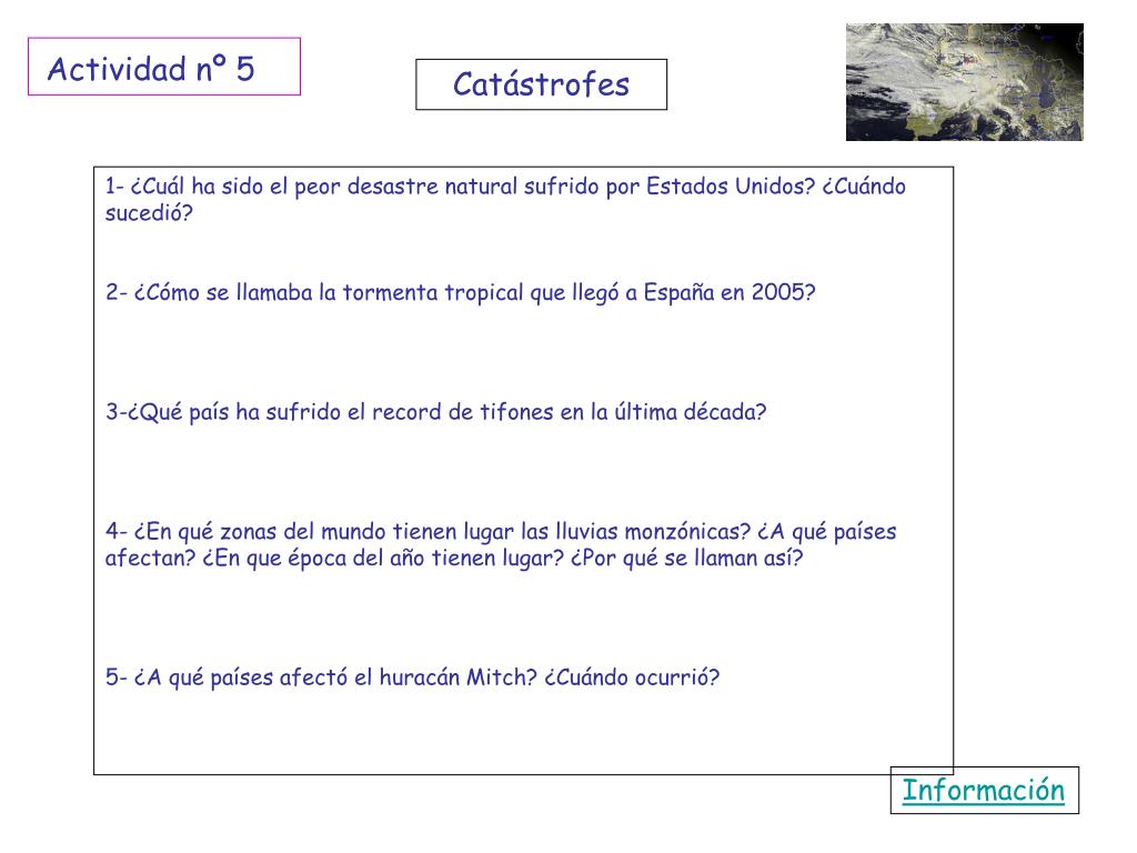 Actividad nº 5 Catástrofes 1- ¿Cuál ha sido el peor desastre natural sufrido por Estados Unidos? ¿Cuándo sucedió? 2- ¿Cómo se llamaba la tormenta tropical que llegó a España en 2005? 3-¿Qué país ha sufrido el record de tifones en la última década? 4- ¿En qué zonas del mundo tienen lugar las lluvias monzónicas? ¿A qué países afectan? ¿En que época del año tienen lugar? ¿Por qué se llaman así? 5- ¿A qué países afectó el huracán Mitch? ¿Cuándo ocurrió? Información