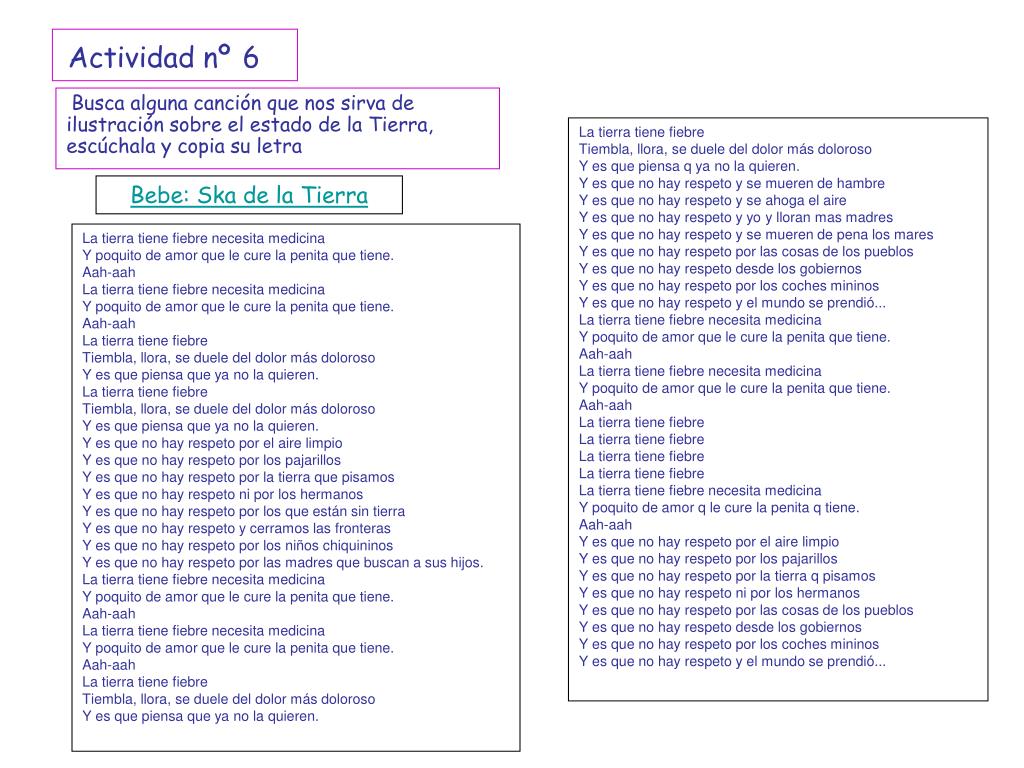 Actividad nº6 Busca alguna canción que nos sirva de ilustración sobre el estado de la Tierra, escúchala y copia su letra La tierra tiene fiebreTiembla, llora, se duele del dolor más dolorosoY es que piensa q ya no la quieren.Y es que no hay respeto y se mueren de hambreY es que no hay respeto y se ahoga el aireY es que no hay respeto y yo y lloran mas madresY es que no hay respeto y se mueren de pena los maresY es que no hay respeto por las cosas de los pueblosY es que no hay respeto desde los gobiernosY es que no hay respeto por los coches mininosY es que no hay respeto y el mundo se prendió...La tierra tiene fiebre necesita medicinaY poquito de amor que le cure la penita que tiene.Aah-aahLa tierra tiene fiebre necesita medicinaY poquito de amor que le cure la penita que tiene.Aah-aahLa tierra tiene fiebreLa tierra tiene fiebreLa tierra tiene fiebreLa tierra tiene fiebreLa tierra tiene fiebre necesita medicinaY poquito de amor q le cure la penita q tiene.Aah-aahY es que no hay respeto por el aire limpioY es que no hay respeto por los pajarillosY es que no hay respeto por la tierra q pisamosY es que no hay respeto ni por los hermanosY es que no hay respeto por las cosas de los pueblosY es que no hay respeto desde los gobiernosY es que no hay respeto por los coches mininosY es que no hay respeto y el mundo se prendió... Bebe: Ska de la Tierra La tierra tiene fiebre necesita medicinaY poquito de amor que le cure la penita que tiene.Aah-aahLa tierra tiene fiebre necesita medicinaY poquito de amor que le cure la penita que tiene.Aah-aahLa tierra tiene fiebreTiembla, llora, se duele del dolor más dolorosoY es que piensa que ya no la quieren.La tierra tiene fiebreTiembla, llora, se duele del dolor más dolorosoY es que piensa que ya no la quieren.Y es que no hay respeto por el aire limpioY es que no hay respeto por los pajarillosY es que no hay respeto por la tierra que pisamosY es que no hay respeto ni por los hermanosY es que no hay respeto por los que están sin tierraY es que no hay respeto y cerramos las fronterasY es que no hay respeto por los niños chiquininosY es que no hay respeto por las madres que buscan a sus hijos.La tierra tiene fiebre necesita medicinaY poquito de amor que le cure la penita que tiene.Aah-aahLa tierra tiene fiebre necesita medicinaY poquito de amor que le cure la penita que tiene.Aah-aahLa tierra tiene fiebreTiembla, llora, se duele del dolor más dolorosoY es que piensa que ya no la quieren.