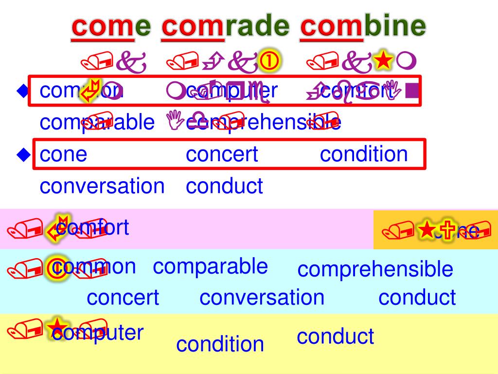 come comrade combine /kÃm/ /Èkm.reId/ /k«mÈbaIn/ • common computer comfort comparable comprehensible • cone concert condition conversation conduct /Ã/ comfort /«U/ cone // common comparable comprehensible concert conversation conduct /«/ computer conduct condition