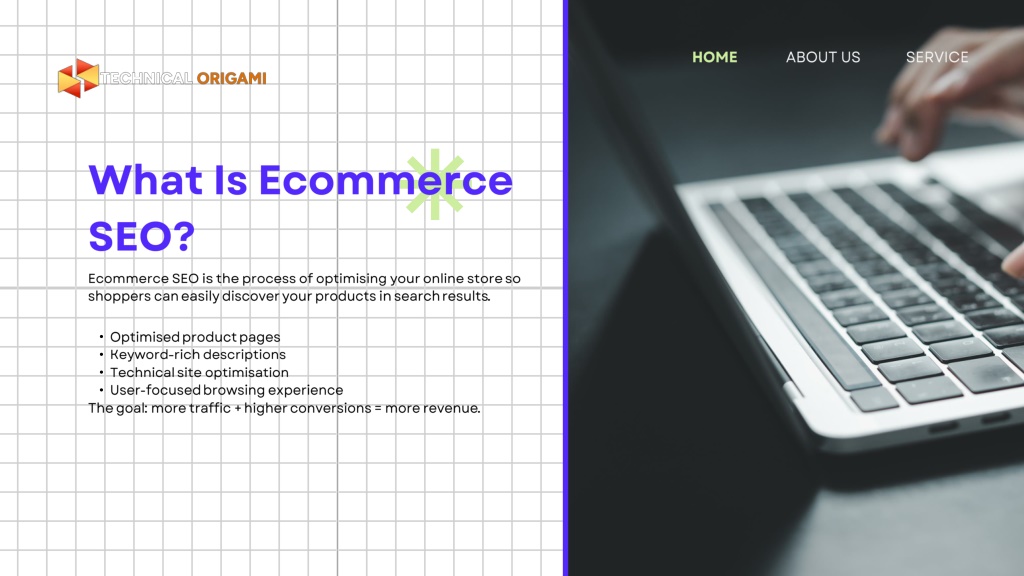 4. TECH-ORIGAMI.COM • HOME • ABOUT US • SERVICE Key Components of Ecommerce SEO • Professional ecommerce SEO includes: • Keyword Research — finding high-intent buyer keywords • On-Page Optimisation — titles, meta tags, URLs, schema • Product Page SEO — compelling copy & structured data • Technical SEO — speed, mobile, indexing • Content Marketing — blogs & buying guides • Link Building — brand authority & trust signals • Every element works together to maximise performance. ecommerce seo agency uk ecommerce seo services in uk Click The Link