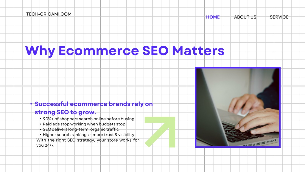 3. TECH-ORIGAMI.COM • HOME • ABOUT US • SERVICE Why Ecommerce SEO Matters • Successful ecommerce brands rely on strong SEO to grow. • 90%+ of shoppers search online before buying • Paid ads stop working when budgets stop • SEO delivers long-term, organic traffic • Higher search rankings = more trust & visibility • With the right SEO strategy, your store works for you 24/7.