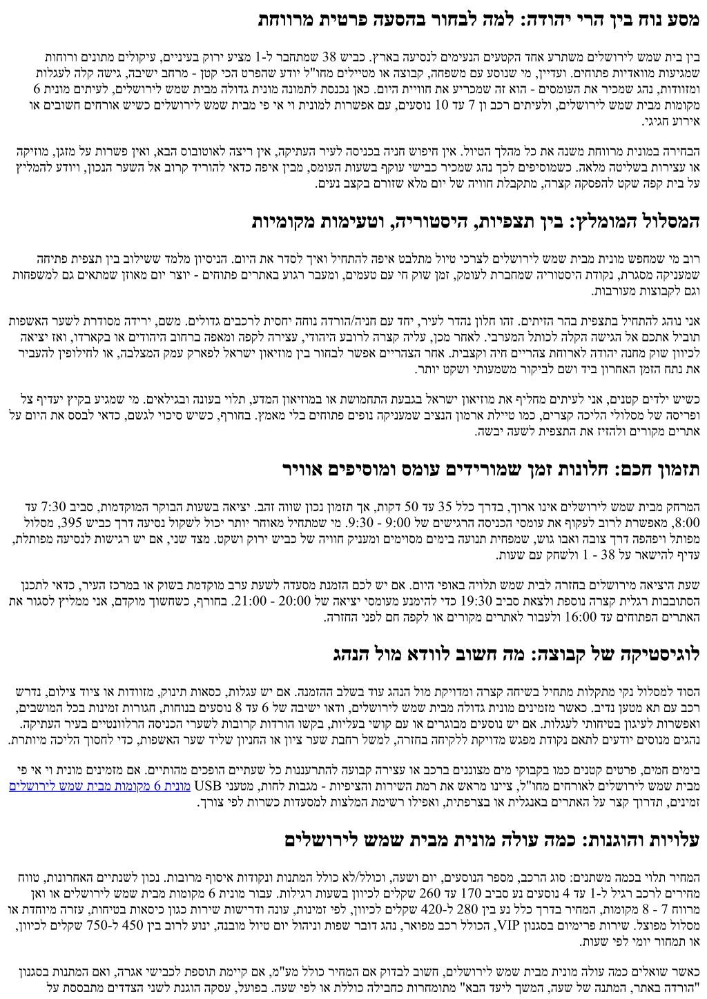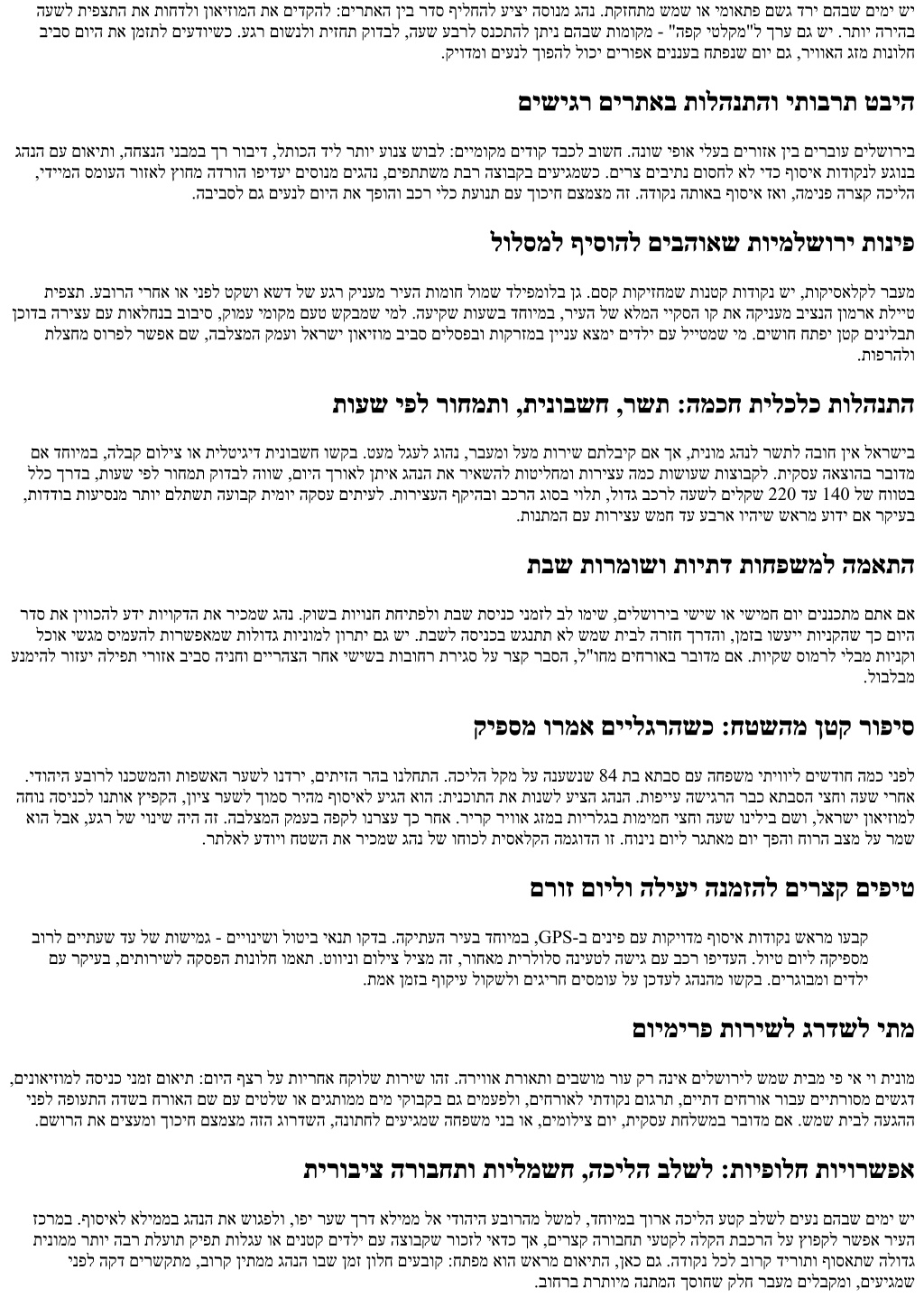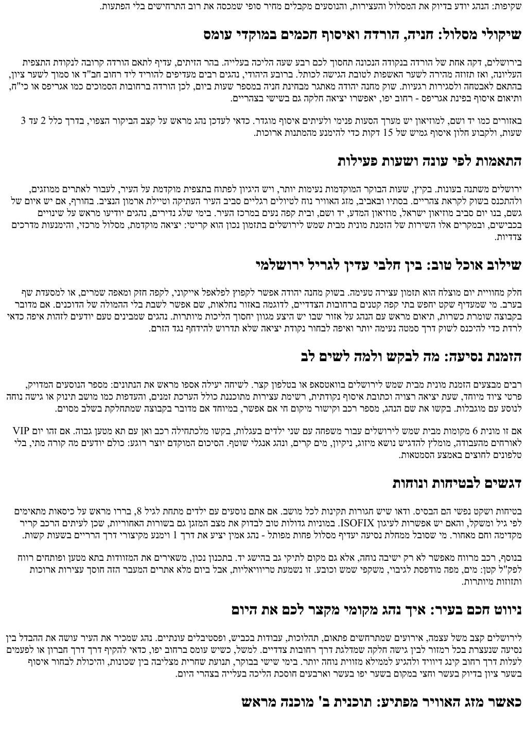 תחוורמ תיטרפ העסהב רוחבל המל :הדוהי ירה ןיב חונ עסמ תוחורו םינותמ םילוקיע ,םייניעב קורי עיצמ 1-ל רבחתמש 38 שיבכ .ץראב העיסנל םימיענה םיעטקה דחא ערתשמ םילשוריל שמש תיב ןיב תולגעל הלק השיג ,הבישי בחרמ - ןטק יכה טרפהש עדוי ל"וחמ םילייטמ וא הצובק ,החפשמ םע עסונש ימ ,ןיידעו .םיחותפ תוידאוומ תועיגמש 6 תינומ םיתיעל ,םילשוריל שמש תיבמ הלודג תינומ הנומתל תסנכנ ןאכ .םויה תייווח תא עירכמש הז אוה - םיסמועה תא ריכמש גהנ ,תודווזמו וא םיבושח םיחרוא שישכ םילשוריל שמש תיבמ יפ יא יו תינומל תורשפא םע ,םיעסונ 10 דע 7 ןו בכר םיתיעלו ,םילשוריל שמש תיבמ תומוקמ .יגיגח עוריא הקיזומ ,ןגזמ לע תורשפ ןיאו ,אבה סובוטואל הציר ןיא ,הקיתעה ריעל הסינכב הינח שופיח ןיא .לויטה ךלהמ לכ תא הנשמ תחוורמ תינומב הריחבה ץילמהל עדויו ,ןוכנה רעשה לא בורק דירוהל יאדכ הפיא ןיבמ ,סמועה תועשב ףקוע ישיבכ ריכמש גהנ ךכל םיפיסומשכ .האלמ הטילשב תוריצע וא .םיענ בצקב םרוזש אלמ םוי לש היווח תלבקתמ ,הרצק הקספהל טקש הפק תיב לע תוימוקמ תומיעטו ,הירוטסיה ,תויפצת ןיב :ץלמומה לולסמה החיתפ תיפצת ןיב בולישש דמלמ ןויסינה .םויה תא רדסל ךיאו ליחתהל הפיא טבלתמ לויט יכרצל םילשוריל שמש תיבמ תינומ שפחמש ימ בור תוחפשמל םג םיאתמש ןזואמ םוי רצוי - םיחותפ םירתאב עוגר רבעמו ,םימעט םע יח קוש ןמז ,קמועל תרבחמש הירוטסיה תדוקנ ,תרגסמ הקינעמש .תוברועמ תוצובקל םגו תופשאה רעשל תרדוסמ הדירי ,םשמ .םילודג םיבכרל תיסחי החונ הדרוה/הינח םע דחי ,ריעל רדהנ ןולח והז .םיתיזה רהב תיפצתב ליחתהל גהונ ינא האיצי זאו ,ודראקב וא םידוהיה בוחרב הפאמו הפקל הריצע ,ידוהיה עבורל הרצק הילע ,ןכמ רחאל .יברעמה לתוכל הלקה השיגה לא םכתא ליבות ריבעהל ןיפוליחל וא ,הבלצמה קמע קראפל לארשי ןואיזומ ןיב רוחבל רשפא םיירהצה רחא .תיבצקו היח םיירהצ תחוראל הדוהי הנחמ קוש ןוויכל .רתוי טקשו יתועמשמ רוקיבל םשו דיב ןורחאה ןמזה חתנ תא לצ ףידעי ץיקב עיגמש ימ .םיאליגבו הנועב יולת ,עדמה ןואיזומב וא תשומחתה תעבגב לארשי ןואיזומ תא ףילחמ םיתיעל ינא ,םינטק םידלי שישכ לע םויה תא ססבל יאדכ ,םשגל יוכיס שישכ ,ףרוחב .ץמאמ ילב םיחותפ םיפונ הקינעמש ביצנה ןומרא תלייט ומכ ,םירצק הכילה ילולסמ לש הסירפו .השבי העשל תיפצתה תא זיזהלו םירוקמ םירתא ריווא םיפיסומו סמוע םידירומש ןמז תונולח :םכח ןומזת דע 7:30 ביבס ,תומדקומה רקובה תועשב האיצי .בהז הווש ןוכנ ןומזת ךא ,תוקד 50 דע 35 ללכ ךרדב ,ךורא וניא םילשוריל שמש תיבמ קחרמה לולסמ ,395 שיבכ ךרד העיסנ לוקשל לוכי רתוי רחואמ ליחתמש ימ .9:30 - 9:00 לש םישיגרה הסינכה יסמוע תא ףוקעל בורל תרשפאמ ,8:00 ,תלתופמ העיסנל תושיגר שי םא ,ינש דצמ .טקשו קורי שיבכ לש היווח קינעמו םימיוסמ םימיב העונת תיחפמש ,שוג ובאו הבוצ ךרד הפהפיו לתופמ .תועש םע קחשלו 1 - 38 לע ראשיהל ףידע ןנכתל יאדכ ,ריעה זכרמב וא קושב תמדקומ ברע תעשל הדעסמ תנמזה םכל שי םא .םויה יפואב היולת שמש תיבל הרזחב םילשורימ האיציה תעש תא רוגסל ץילממ ינא ,םדקומ ךושחשכ ,ףרוחב .21:00 - 20:00 לש האיצי יסמועמ ענמיהל ידכ 19:30 ביבס תאצלו תפסונ הרצק תילגר תובבותסה .הרזחה ינפל םח הפקל וא םירוקמ םירתאל רובעלו 16:00 דע םיחותפה םירתאה גהנה לומ אדוול בושח המ :הצובק לש הקיטסיגול שרדנ ,םוליצ דויצ וא תודווזמ ,קונית תואסכ ,תולגע שי םא .הנמזהה בלשב דוע גהנה לומ תקיודמו הרצק החישב ליחתמ תולקתמ יקנ לולסמל דוסה ,םיבשומה לכב תונימז תורוגח ,תוחונב םיעסונ 8 דע 6 לש הבישי ואדו ,םילשוריל שמש תיבמ הלודג תינומ םינימזמ רשאכ .בידנ ןעטמ את םע בכר .הקיתעה ריעב םייטנוולרה הסינכה ירעשל תובורק תודרוה ושקב ,תוילעב ישוק םע וא םירגובמ םיעסונ שי םא .תולגעל יתוחיטב ןוגיעל תורשפאו .תרתוימ הכילה ךוסחל ידכ ,תופשאה רעש דילש ןוינחה וא ןויצ רעש תבחר לשמל ,הרזחב החיקלל תקיודמ שגפמ תדוקנ םאתל םיעדוי םיסונמ םיגהנ יפ יא יו תינומ םינימזמ םא .םייתוהמ םיכפוה םייתעש לכ תוננערתהל העובק הריצע וא בכרב םיננוצמ םימ יקובקב ומכ םינטק םיט