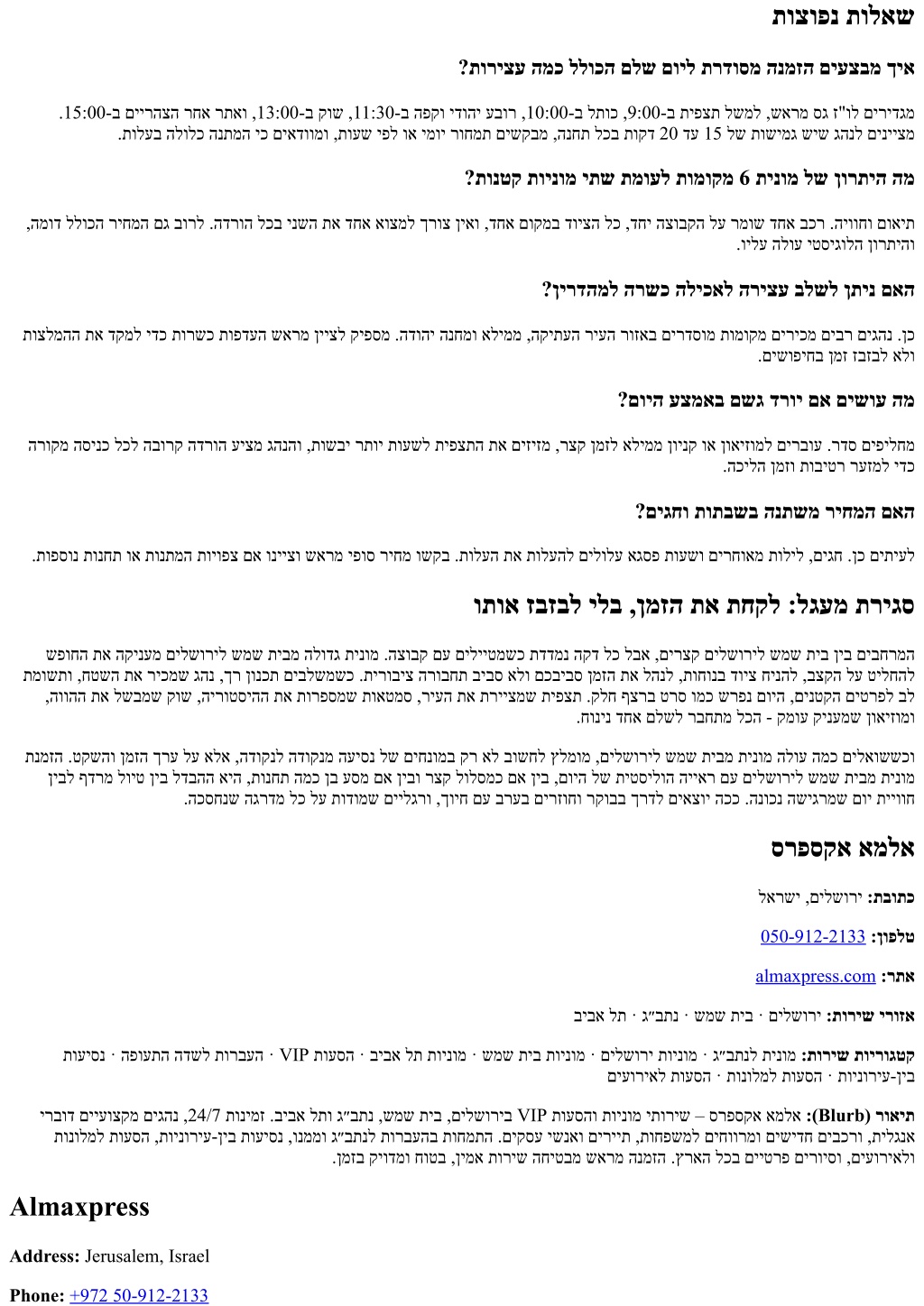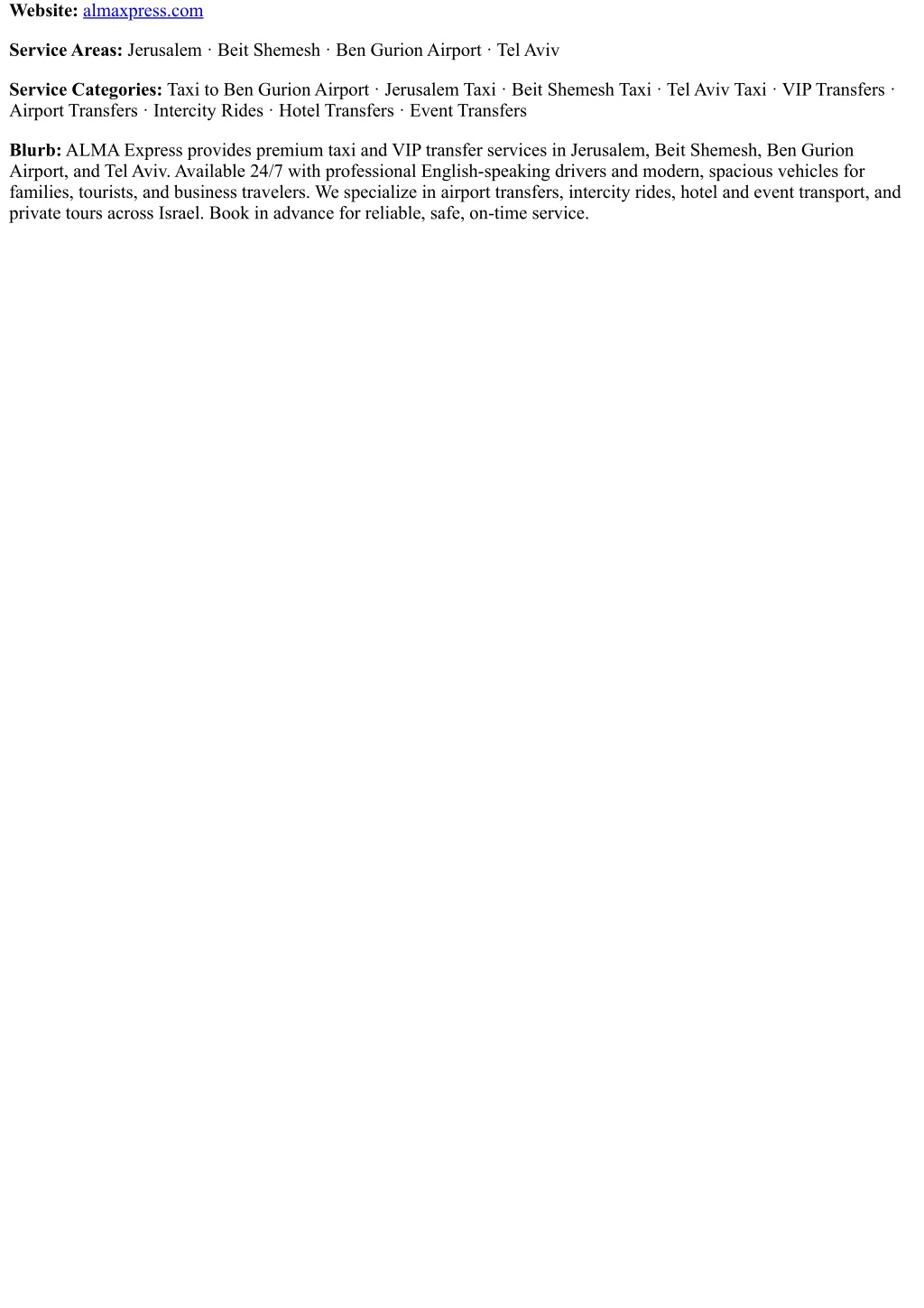 Website:almaxpress.com Service Areas: Jerusalem · Beit Shemesh · Ben Gurion Airport · Tel Aviv Service Categories: Taxi to Ben Gurion Airport · Jerusalem Taxi · Beit Shemesh Taxi · Tel Aviv Taxi · VIP Transfers · Airport Transfers · Intercity Rides · Hotel Transfers · Event Transfers Blurb: ALMA Express provides premium taxi and VIP transfer services in Jerusalem, Beit Shemesh, Ben Gurion Airport, and Tel Aviv. Available 24/7 with professional English-speaking drivers and modern, spacious vehicles for families, tourists, and business travelers. We specialize in airport transfers, intercity rides, hotel and event transport, and private tours across Israel. Book in advance for reliable, safe, on-time service.