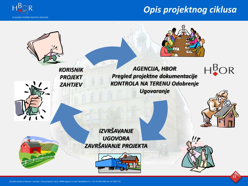 AGENCIJA, HBOR Pregled projektne dokumentacije KONTROLA NA TERENU Odobrenje Ugovaranje KORISNIK PROJEKT ZAHTJEV IZVRŠAVANJE UGOVORA ZAVRŠAVANJE PROJEKTA Opis projektnog ciklusa