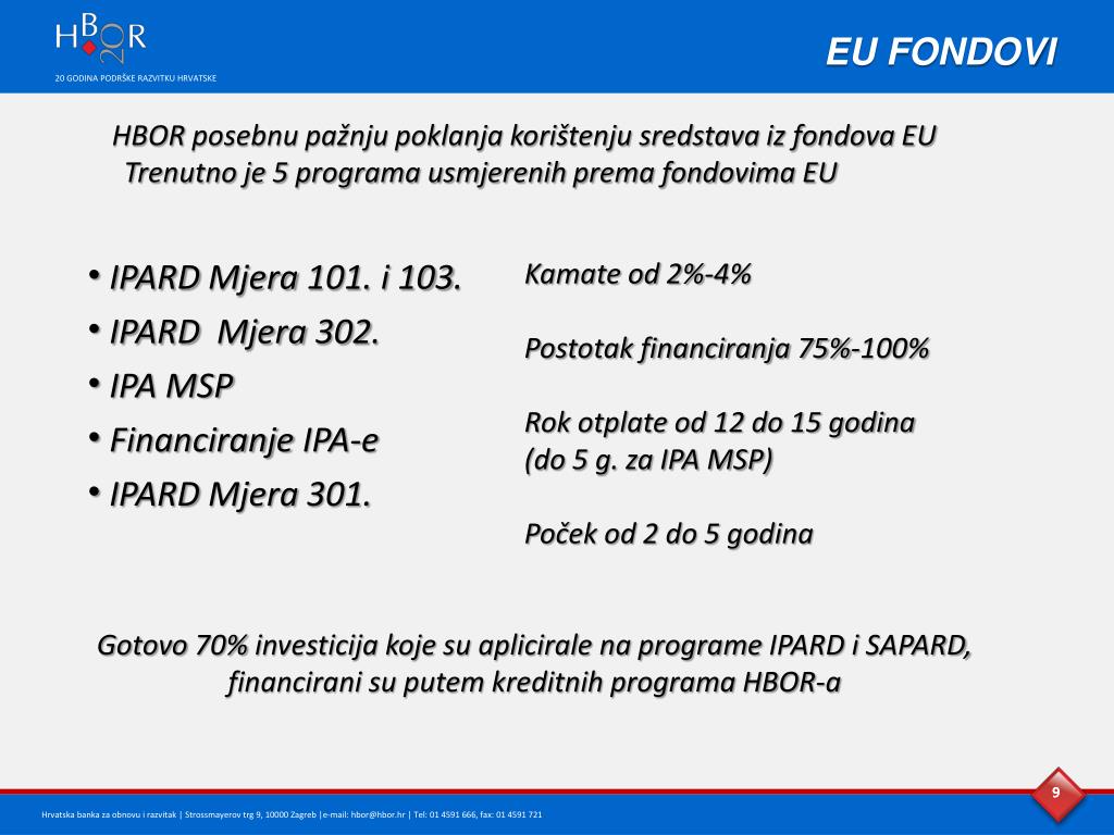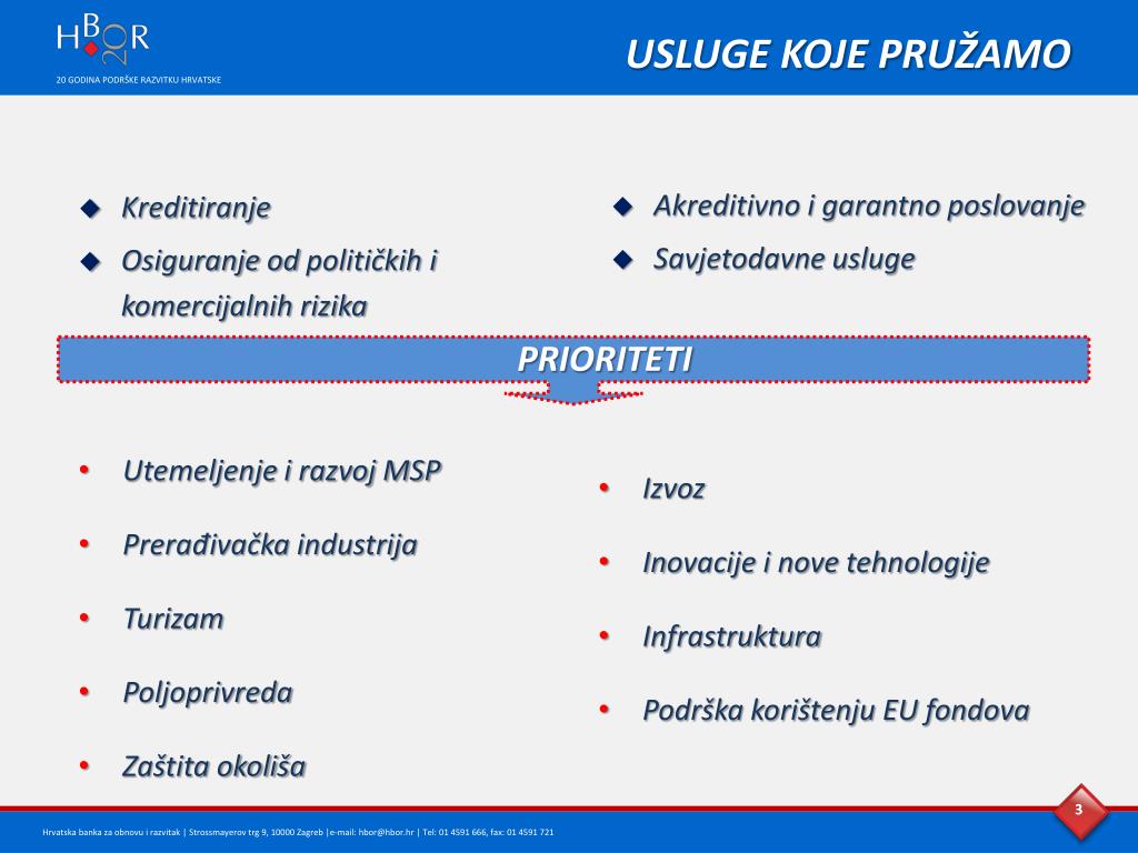 Općenito o HBOR-u Hrvatska banka za obnovu i razvitak osnovana je 1992. godine Osnivač i 100% vlasnik banke je Republika Hrvatska Temeljni kapital HBOR-a iznosi 7,7 milijardi kuna Suradnja sa međunarodnim financijskim institucijama:EIB, IBRD, KfW, CEB, itd. Temeljni ciljevi • Potpora obnovi i razvitku gospodarstva RH • Regionalno usmjeravanje sredstava radi uravnoteženja razvitka svih područja RH • Naglasak na poticanje razvoja područja od posebne državne skrbi • Promicanje važnosti zaštite okoliša i održivog razvitka OPĆENITO O HBOR-u
