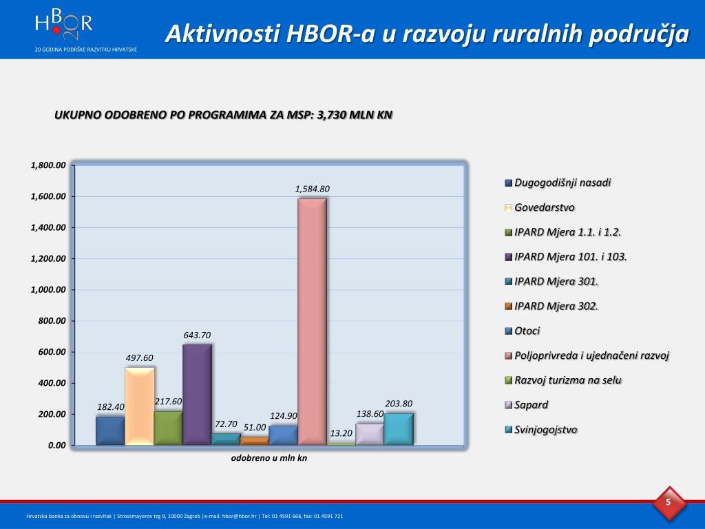 Ruralni razvoj • Ruralna područja Hrvatske čine više od 90 % kopnenoga dijela Hrvatske (ili 61% naseljenoga dijela Hrvatske). Na njima živi oko 47% ukupnoga stanovništva Hrvatske. • Osnovno obilježje politike ruralnog razvoja je nastojanje da se razvojno zaostajanje ruralnih područja zaustavi učinkovitim korištenjem svih njihovih resursa. • Od svog osnutka, HBOR je dio svojih aktivnosti usmjerio u poticanje i razvoj ruralnih područja u okviru većine programa kreditiranja koje provodi. • Poseban značaj HBOR-a u razvitku ruralnih područja razvidan je kroz podršku u kreditiranju projekata prijavljenih u EU fondove, kroz SAPARD/IPARD programe kreditiranja. 4