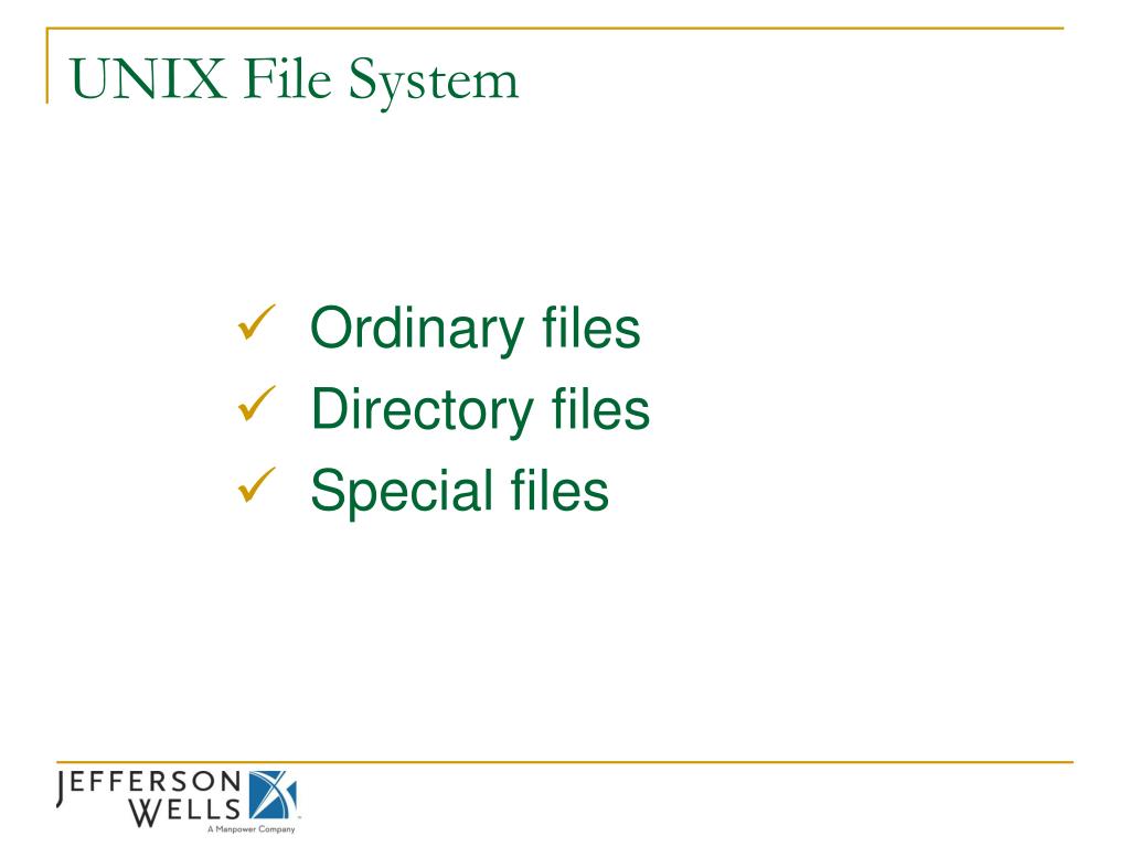 Windows File System • Supports two file system • FAT (File Allocation Table) • File system does not record security information such as owner or access permission of a file or directory • NTFS (New Technology Files System) • Supports a variety of multi-user security models • NTFS Vs FAT • Fault tolerance • Access Control by directory or file • Can compress individual or directories • POSIX support