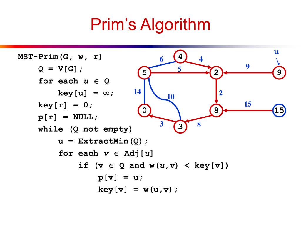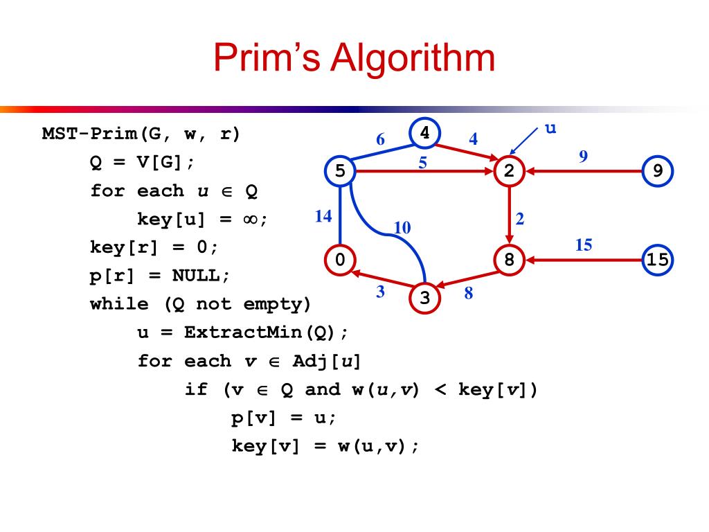Prim’s Algorithm MST-Prim(G, w, r) Q = V[G]; for each u Q key[u] = ; key[r] = 0; p[r] = NULL; while (Q not empty) u = ExtractMin(Q); for each v Adj[u] if (v Q and w(u,v) < key[v]) p[v] = u; key[v] = w(u,v); 4 6 4 9 5 5 2 9 u 14 2 10 15 0 8 15 3 8 3