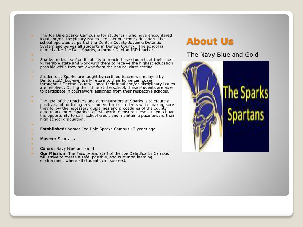 About Us • The Joe Dale Sparks Campus is for students - who have encountered legal and/or disciplinary issues - to continue their education. The school operates as part of the Denton County Juvenile Detention System and serves all students in Denton County. The school is named after Joe Dale Sparks, a former Denton ISD teacher. • Sparks prides itself on its ability to reach these students at their most vulnerable state and work with them to receive the highest education possible while they are away from the natural class setting. • Students at Sparks are taught by certified teachers employed by Denton ISD, but eventually return to their home campuses throughout Denton County - once their legal and/or disciplinary issues are resolved. During their time at the school, these students are able to participate in coursework assigned from their respective schools. • The goal of the teachers and administrators at Sparks is to create a positive and nurturing environment for its students while making sure they follow the necessary guidelines and procedures of the county detention center. Sparks staff will work to ensure these students have the opportunity to earn school credit and maintain a pace toward their high school graduation. • Established: Named Joe Dale Sparks Campus 13 years ago • Mascot: Spartans • Colors: Navy Blue and Gold • Our Mission: The Faculty and staff of the Joe Dale Sparks Campus will strive to create a safe, positive, and nurturing learning environment where all students can succeed. The Navy Blue and Gold