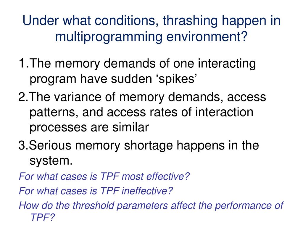 Under what conditions, thrashing happen in multiprogramming environment? 1.The memory demands of one interacting program have sudden ‘spikes’ 2.The variance of memory demands, access patterns, and access rates of interaction processes are similar 3.Serious memory shortage happens in the system. For what cases is TPF most effective? For what cases is TPF ineffective? How do the threshold parameters affect the performance of TPF?