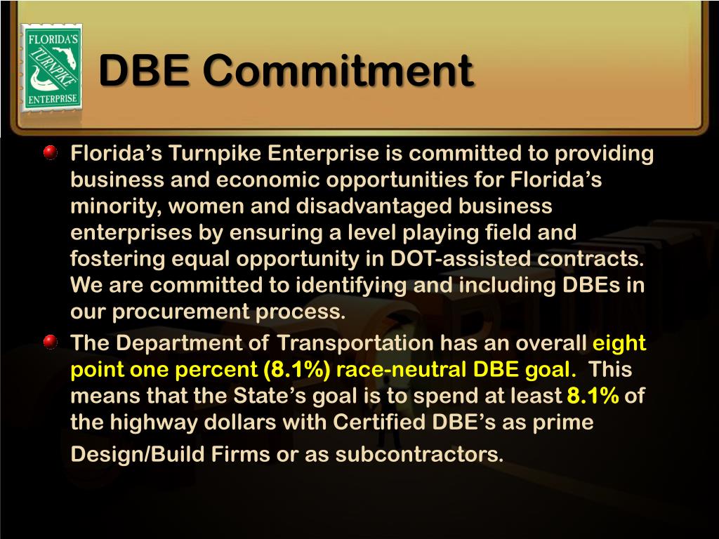 DBE Commitment • Florida’s Turnpike Enterprise is committed to providing business and economic opportunities for Florida’s minority, women and disadvantaged business enterprises by ensuring a level playing field and fostering equal opportunity in DOT-assisted contracts. We are committed to identifying and including DBEs in our procurement process. • The Department of Transportation has an overall eight point one percent (8.1%) race-neutral DBE goal. This means that the State’s goal is to spend at least 8.1% of the highway dollars with Certified DBE’s as prime Design/Build Firms or as subcontractors.