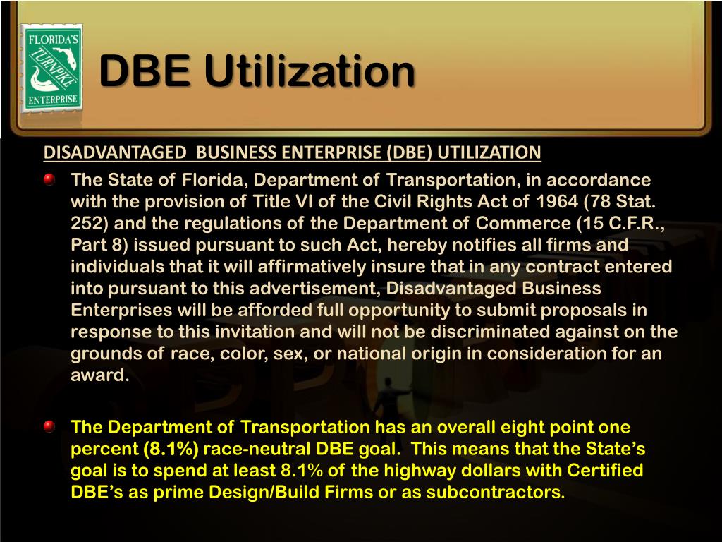 DBE Utilization DISADVANTAGED BUSINESS ENTERPRISE (DBE) UTILIZATION • The State of Florida, Department of Transportation, in accordance with the provision of Title VI of the Civil Rights Act of 1964 (78 Stat. 252) and the regulations of the Department of Commerce (15 C.F.R., Part 8) issued pursuant to such Act, hereby notifies all firms and individuals that it will affirmatively insure that in any contract entered into pursuant to this advertisement, Disadvantaged Business Enterprises will be afforded full opportunity to submit proposals in response to this invitation and will not be discriminated against on the grounds of race, color, sex, or national origin in consideration for an award. • The Department of Transportation has an overall eight point one percent (8.1%) race-neutral DBE goal. This means that the State’s goal is to spend at least 8.1% of the highway dollars with Certified DBE’s as prime Design/Build Firms or as subcontractors.