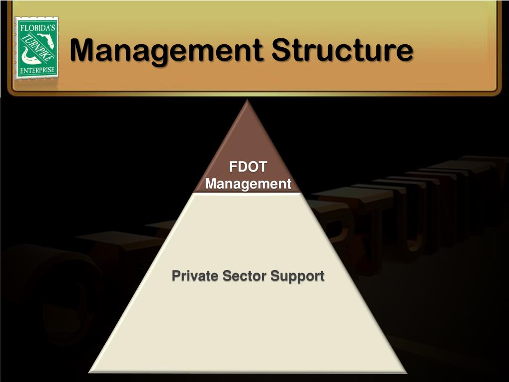 Organization Governor Transportation Commission Secretary Executive Director Chief Executive Officer FHP Troop K Communications & Marketing General Counsel Government Affairs Deputy Executive Director Chief Operating Officer Deputy Executive Director Chief Financial Officer Planning & Production Financial Planning Highway Operations Financial Services Toll Operations Work Program Contractual Services Business Development & Concessions Management Administration