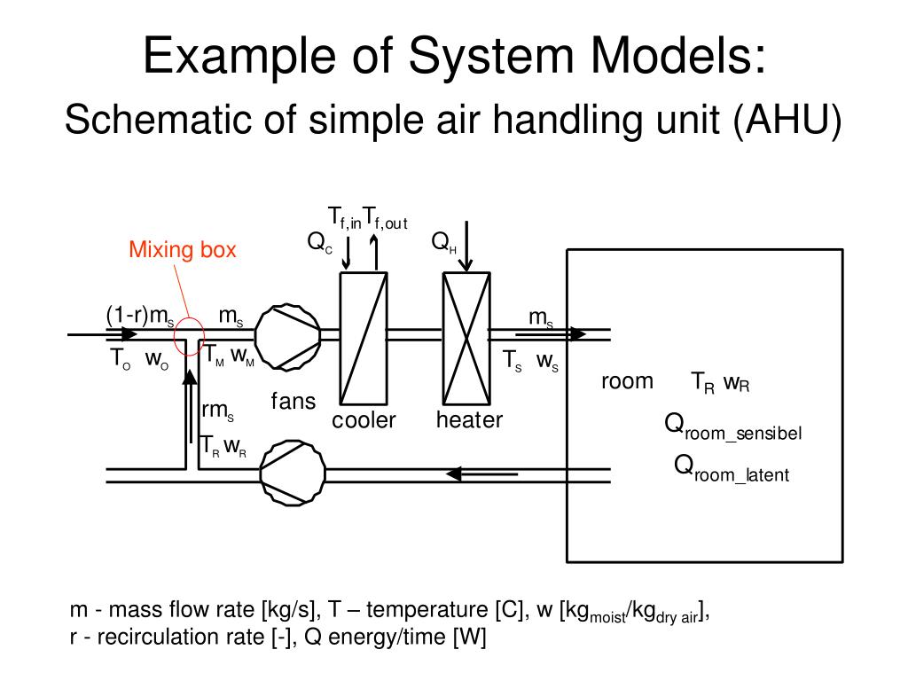 Example of System Models:Schematic of simple air handling unit (AHU) Mixing box m - mass flow rate [kg/s], T – temperature [C], w [kgmoist/kgdry air], r - recirculation rate [-], Q energy/time [W]