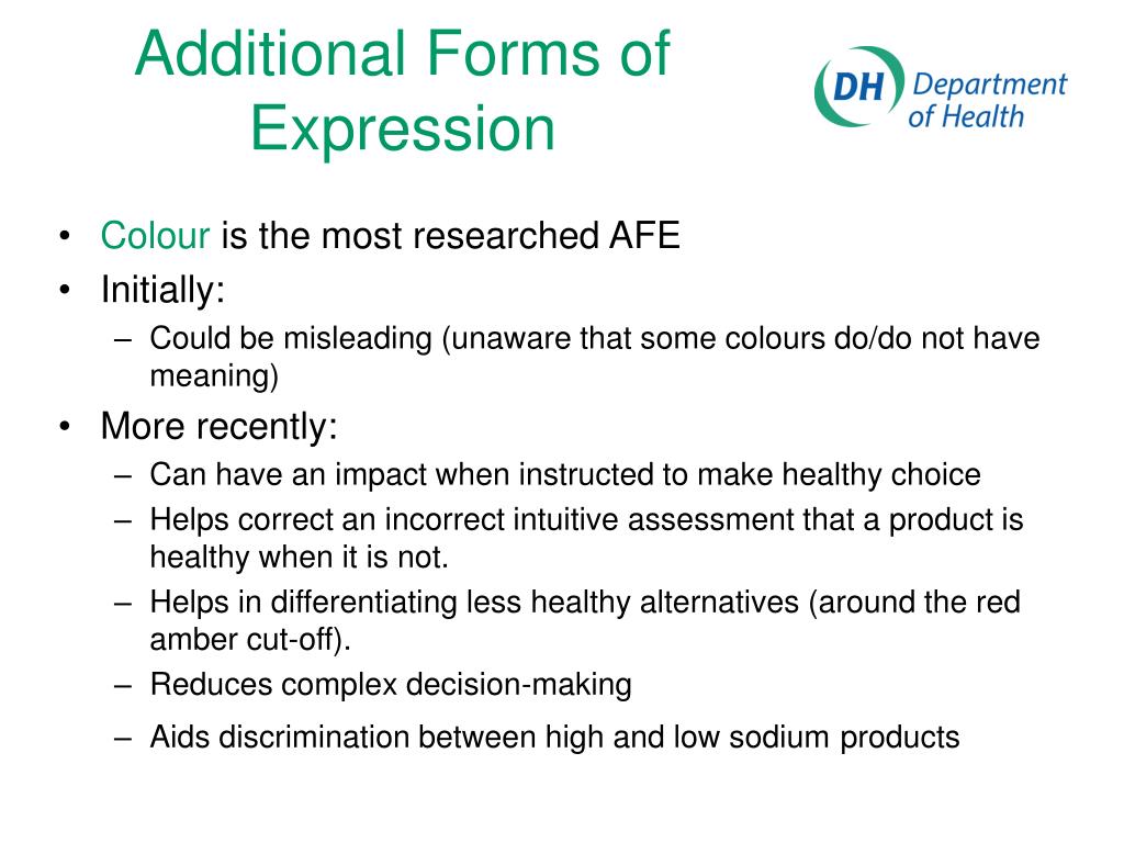 Additional Forms of Expression • Colour is the most researched AFE • Initially: • Could be misleading (unaware that some colours do/do not have meaning) • More recently: • Can have an impact when instructed to make healthy choice • Helps correct an incorrect intuitive assessment that a product is healthy when it is not. • Helps in differentiating less healthy alternatives (around the red amber cut-off). • Reduces complex decision-making • Aids discrimination between high and low sodiumproducts
