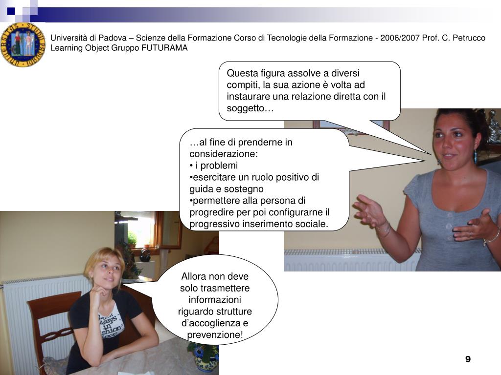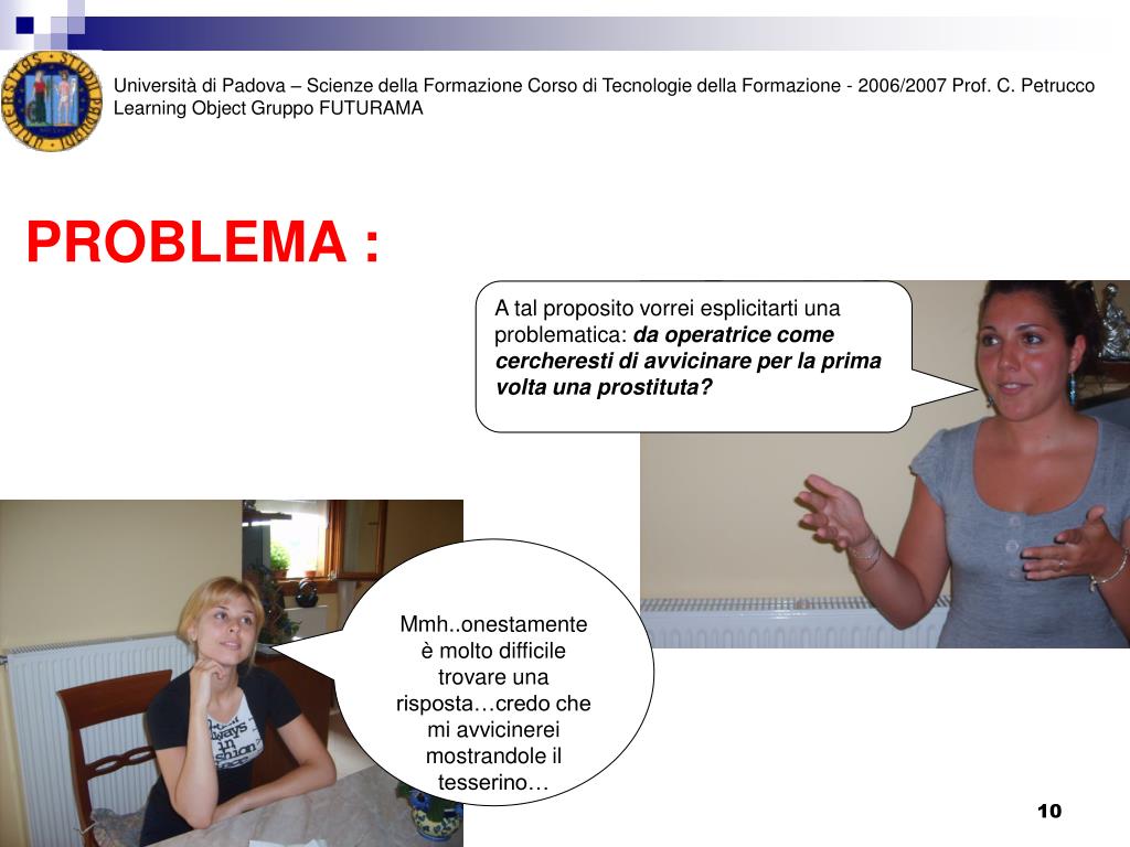 Università di Padova – Scienze della Formazione Corso di Tecnologie della Formazione - 2006/2007 Prof. C. Petrucco Learning Object Gruppo FUTURAMA PROBLEMA : A tal proposito vorrei esplicitarti una problematica: da operatrice come cercheresti di avvicinare per la prima volta una prostituta? Mmh..onestamente è molto difficile trovare una risposta…credo che mi avvicinerei mostrandole il tesserino…