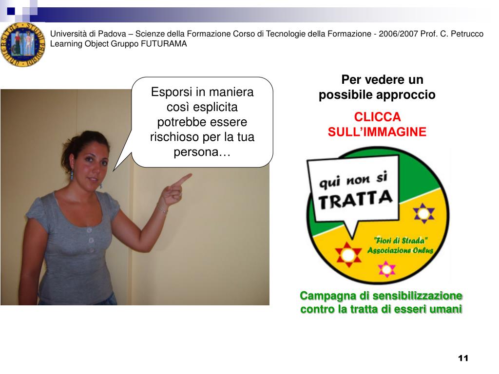 Università di Padova – Scienze della Formazione Corso di Tecnologie della Formazione - 2006/2007 Prof. C. Petrucco Learning Object Gruppo FUTURAMA Per vedere un possibile approccio CLICCA SULL’IMMAGINE Esporsi in maniera così esplicita potrebbe essere rischioso per la tua persona… Campagna di sensibilizzazionecontro la tratta di esseri umani