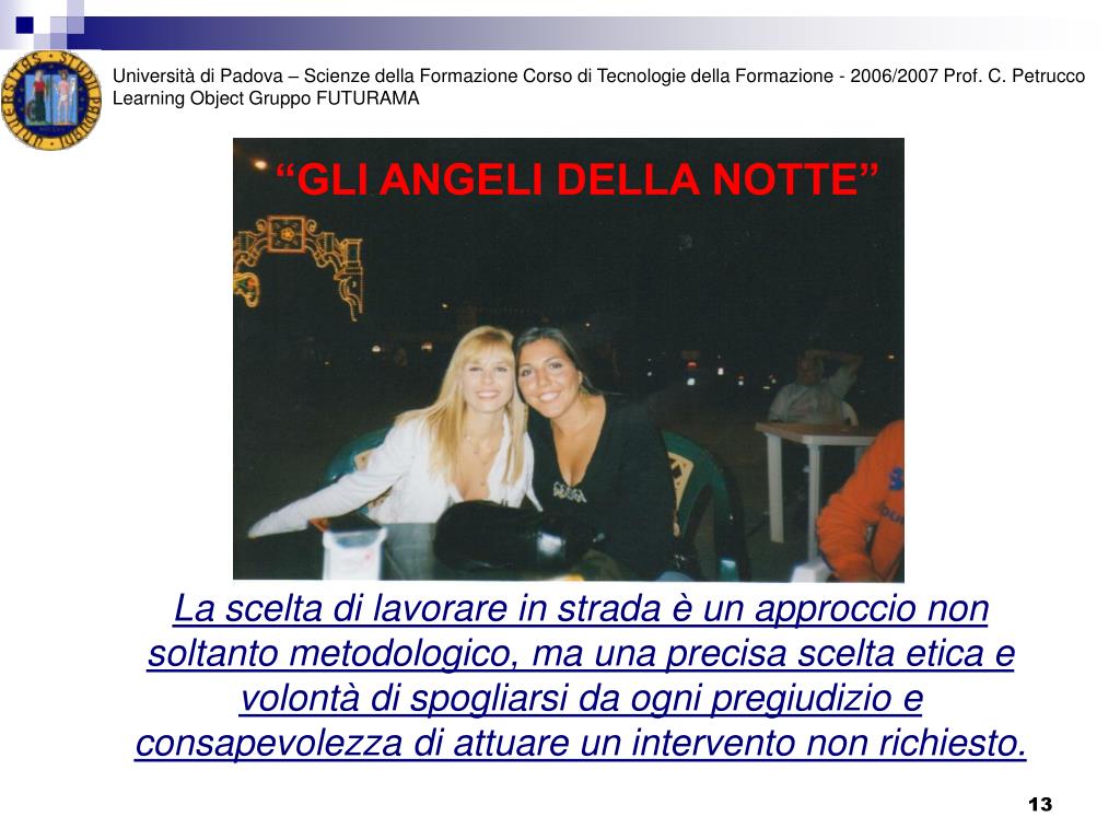 Università di Padova – Scienze della Formazione Corso di Tecnologie della Formazione - 2006/2007 Prof. C. Petrucco Learning Object Gruppo FUTURAMA “GLI ANGELI DELLA NOTTE” La scelta di lavorare in strada è un approccio non soltanto metodologico, ma una precisa scelta etica e volontà di spogliarsi da ogni pregiudizio e consapevolezza di attuare un intervento non richiesto.