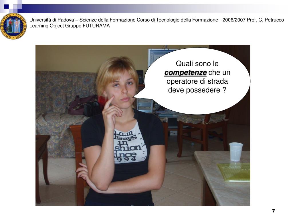 Università di Padova – Scienze della Formazione Corso di Tecnologie della Formazione - 2006/2007 Prof. C. Petrucco Learning Object Gruppo FUTURAMA Quali sono le competenze che un operatore di strada deve possedere ?